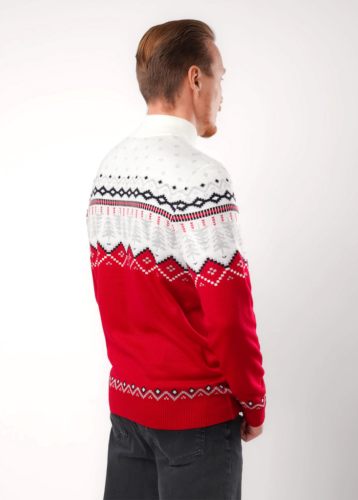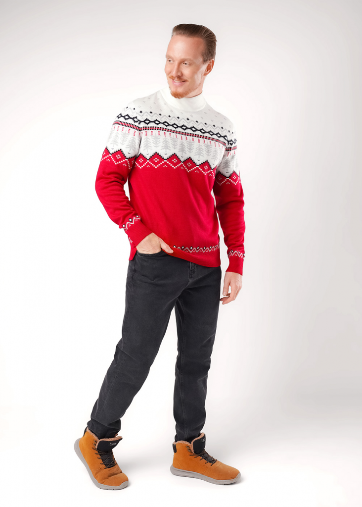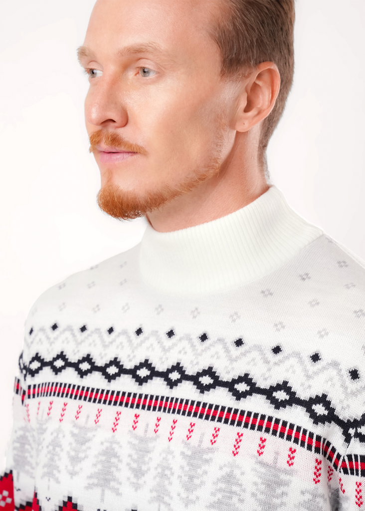 Мужской новогодний свитер из акриловой пряжи, воротом и манжетами - прекрасный подарок самым близким. В изделии сохранились тепло, уют и отличное качество. А стильный скандинавский рисунок уже стал настоящей классикой нашего времени.