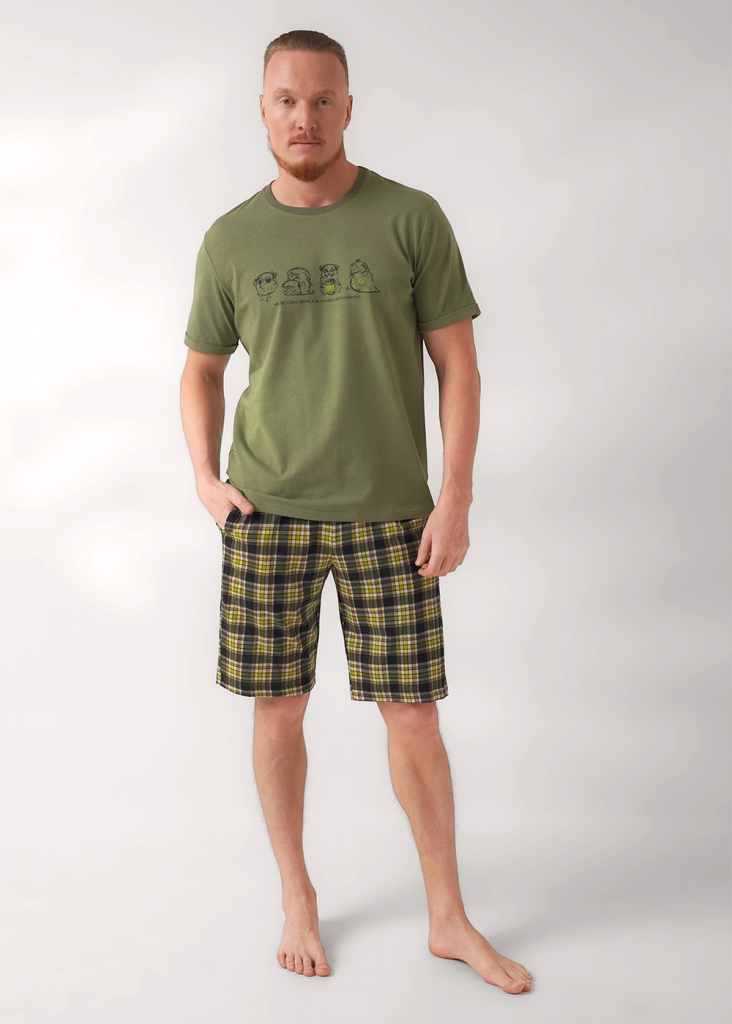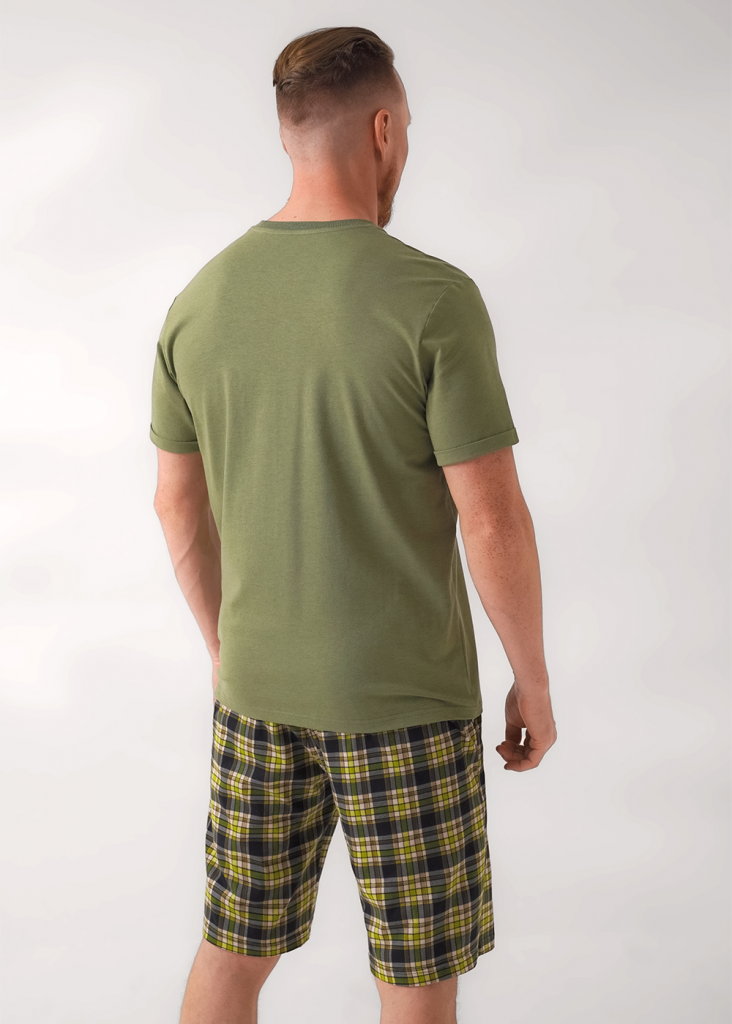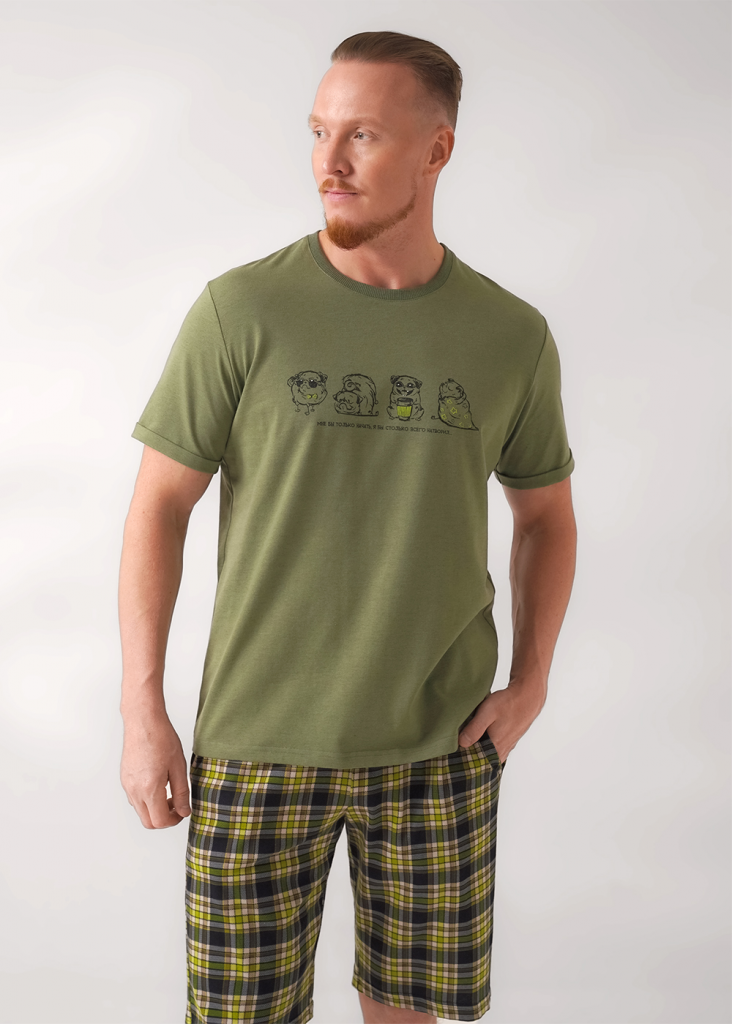 Набор состоящий из футболки и шорт. Футболка из хлопковой кулирной глади с эластаном с округлой горловиной, коротким рукавом и дизайнерским принтом. Шорты в клетку из кулирной глади с карбоном на эластичном поясе с функциональными карманами и шнуром.