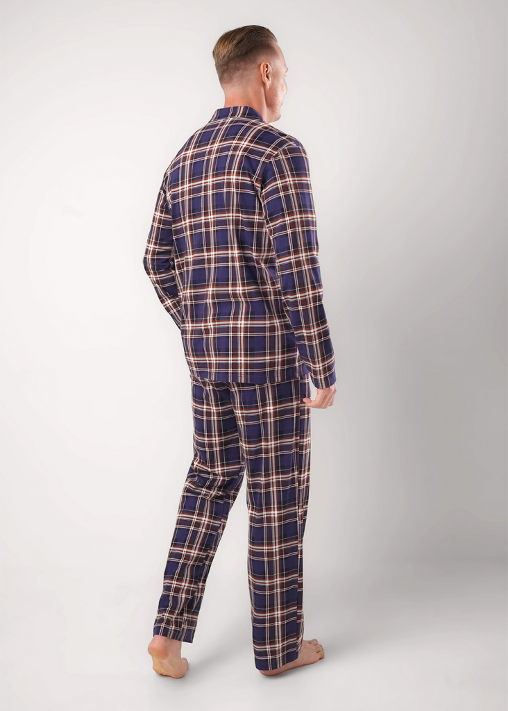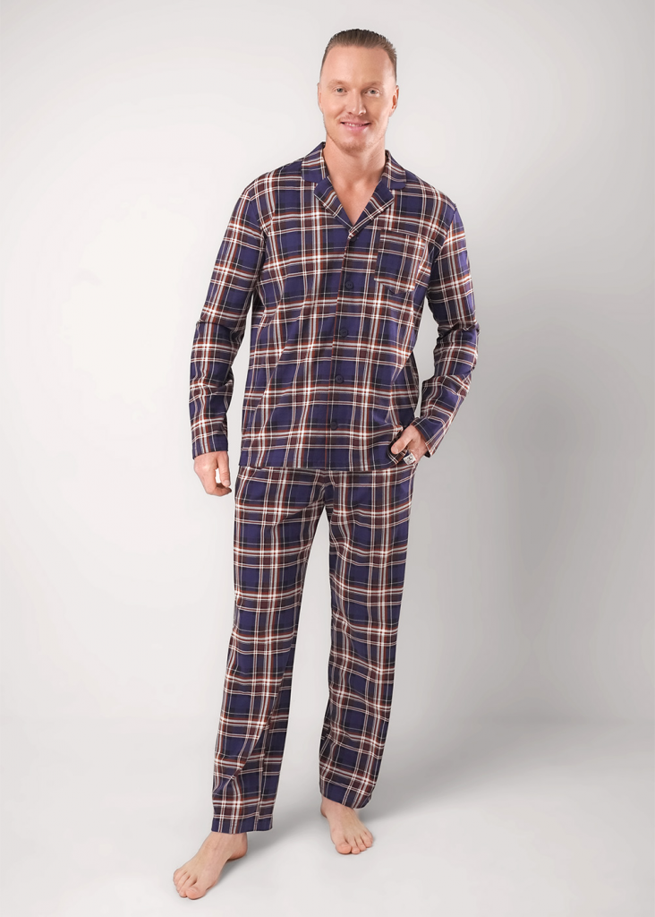 Пижама в оригинальную клетку из мягкого трикотажа с карбоном. Жакет с застежкой на пуговицы, отложным воротником и карманом. Прямые брюки с эластичным поясом, шнуром для регулировки по размеру и двумя функциональными карманами по бокам.