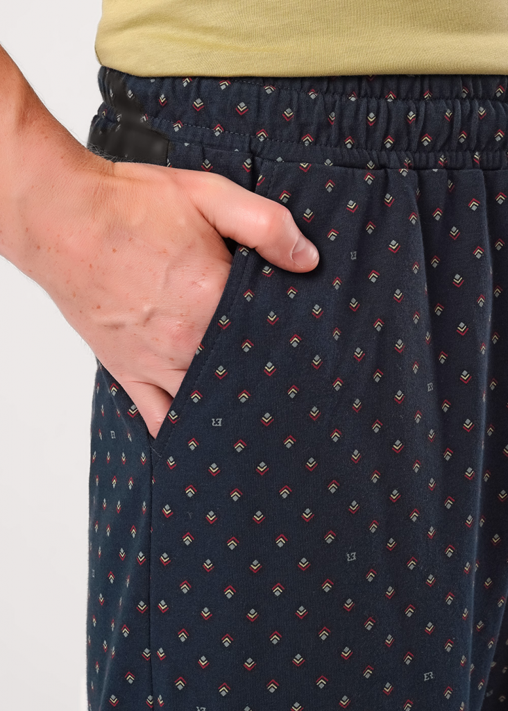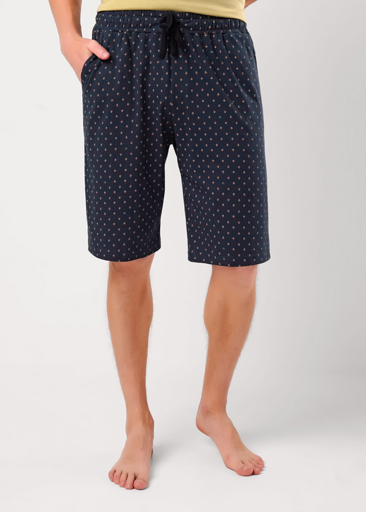 Набор мужской для дома состоящий из футболки и шорт. Футболка из кулирной глади с фигурной горловиной, коротким рукавом и принтом. Шорты из набивной кулирной глади на эластичном поясе с функциональными карманами и шнуром.