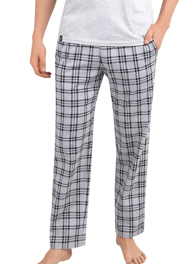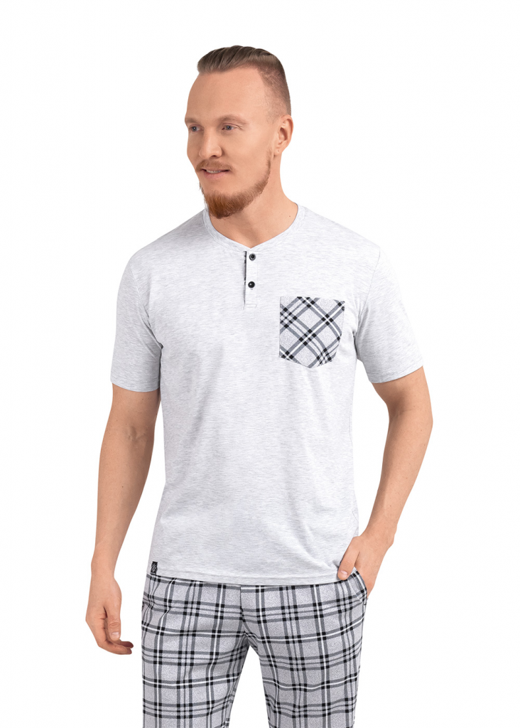 Комплект домашний, состоящий из футболки и брюк. Футболка с круглым вырезом горловины, коротким рукавом, нагрудным карманом и функциональной планкой на две пуговицы. Брюки из трикотажного полотна на эластичном поясе с боковыми карманами и шнуром.