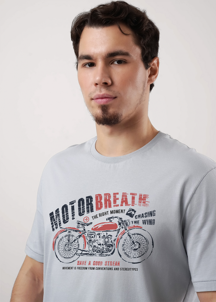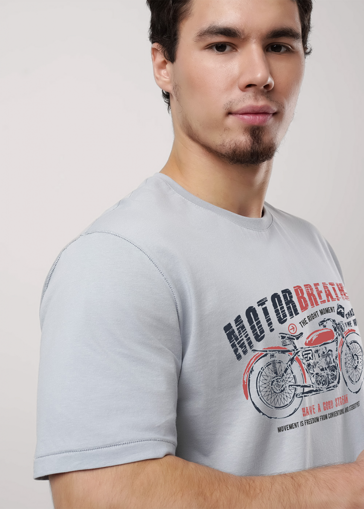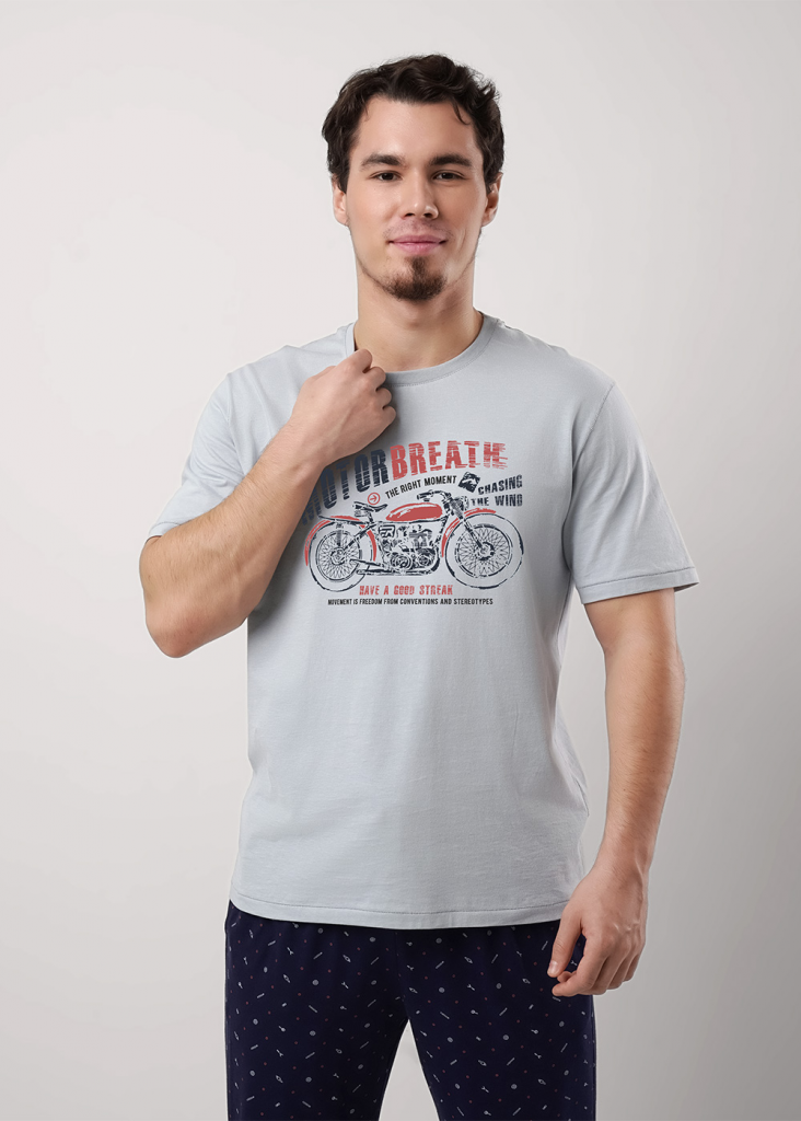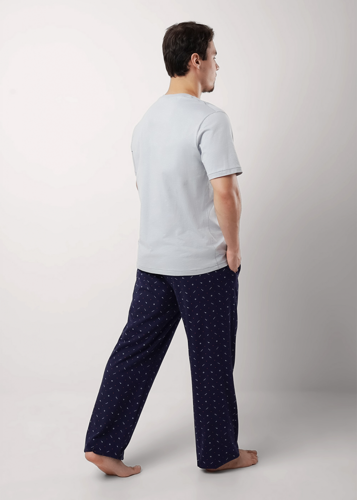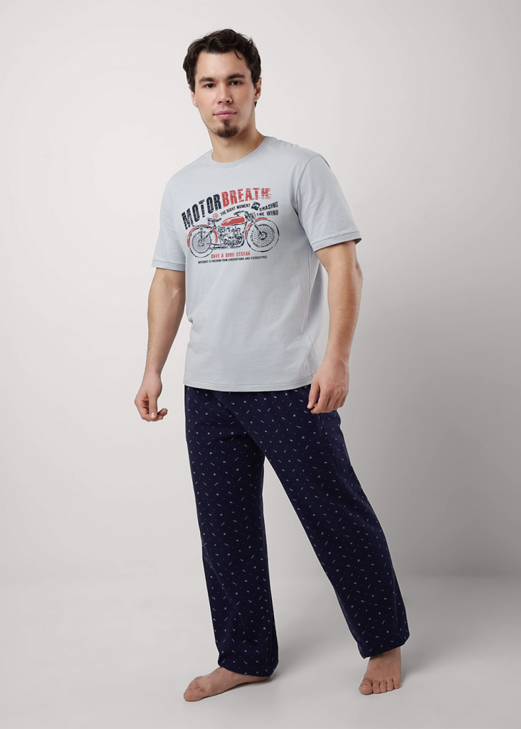 Комплект мужской, состоящий из футболки и брюк. Футболка из трикотажного полотна с коротким рукавом, спереди дизайнерский принт. Брюки из трикотажа в набивку на широком поясе с резинкой и регулируемым шнуром, по бокам удобные карманы.