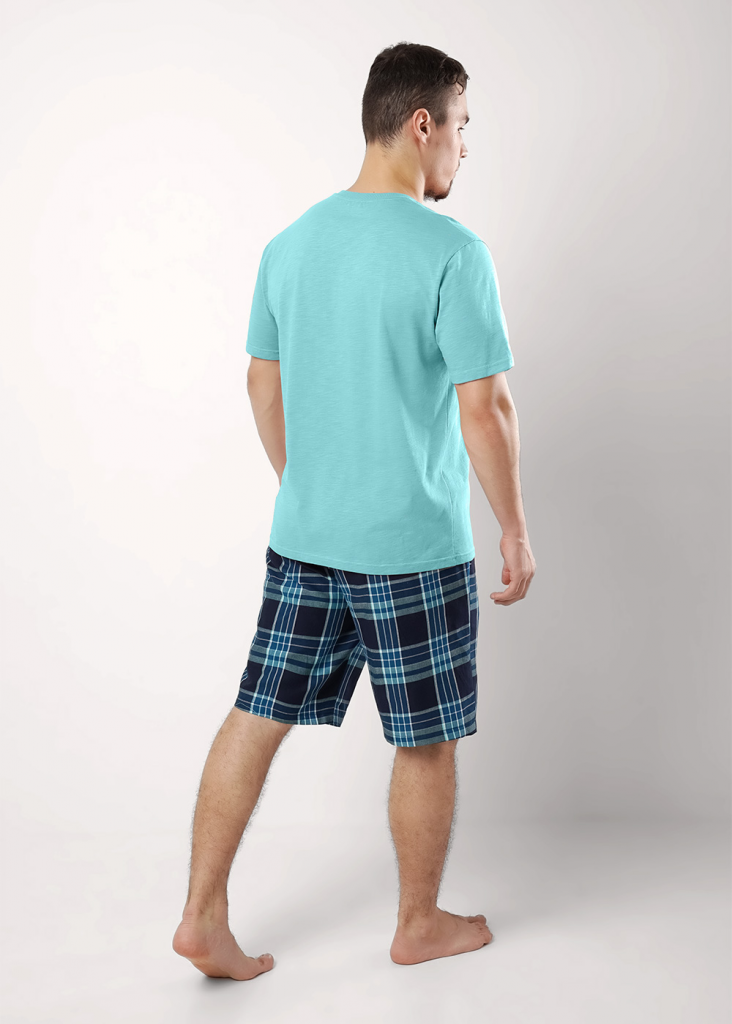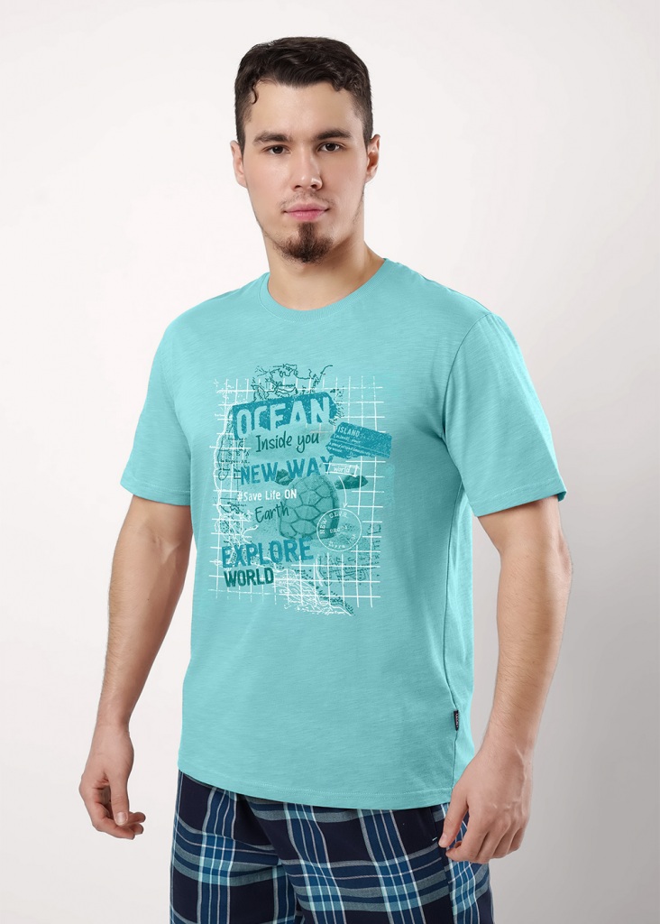 Набор мужской для дома состоящий из футболки и шорт. Футболка из однотонной кулирной глади с круглым вырезом горловины, коротким рукавом и дизайнерским принтом. Шорты из набивного поплина на эластичном поясе с функциональными карманами и шнуром.