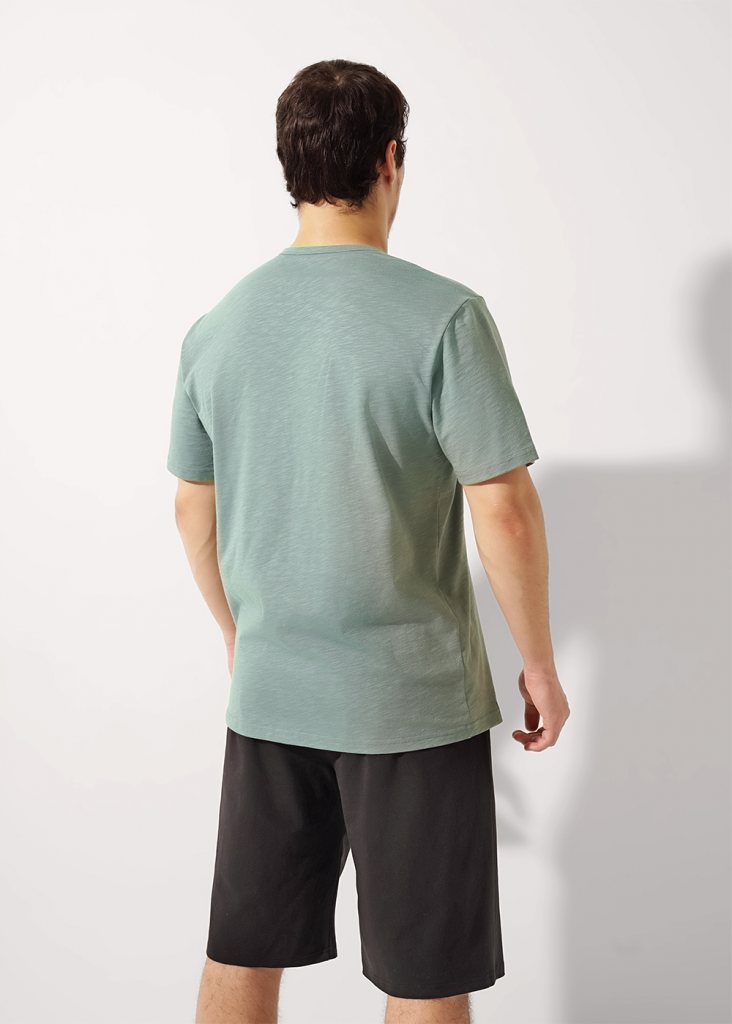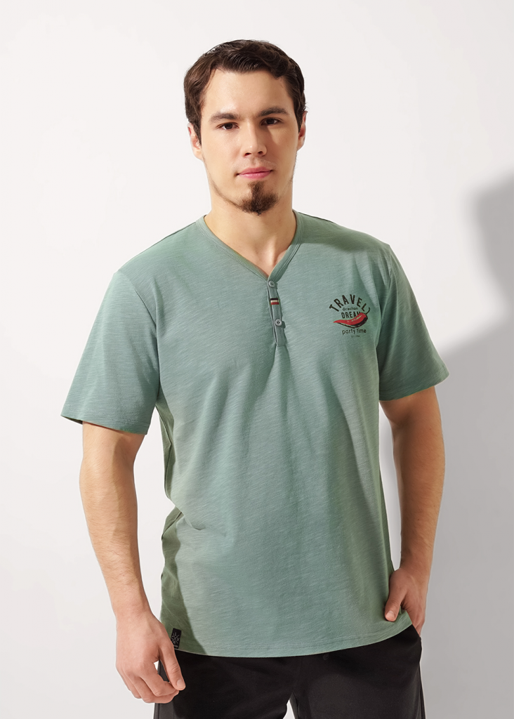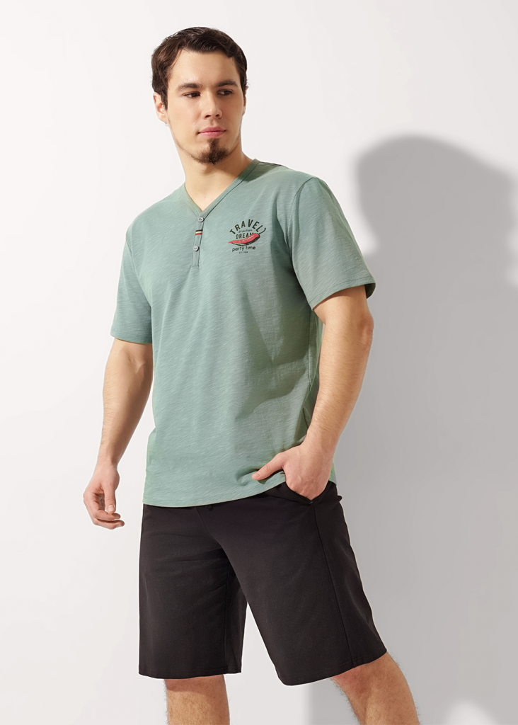 Набор мужской для дома: футболка из хлопкового полотна "флам" с фигурной горловиной с иммитацией планки с дизайнерским принтом. Шорты из трикотажного полотна на широком поясе с резинкой и регулируемым шнуром, по бокам удобные карманы.