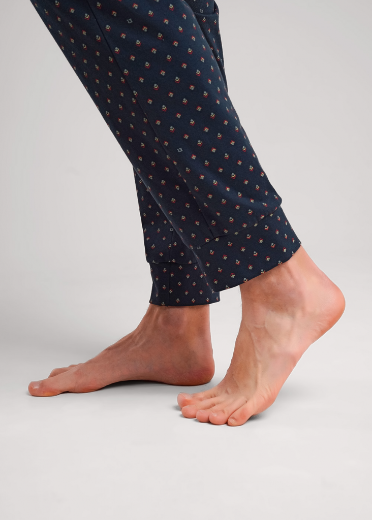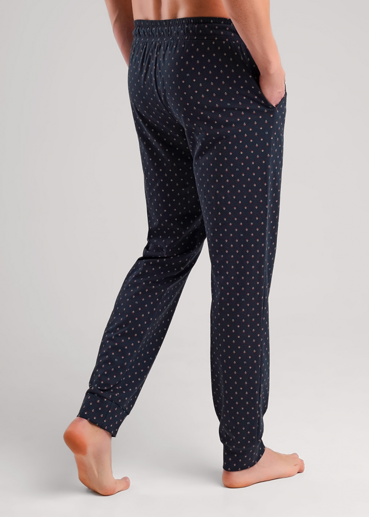 Мужские домашние брюки на манжете из хлопковой глади в дизайнерскую набивку. Комфортные брюки хорошо держат форму и не сковывают движений. Отличное решение для домашнего образа.