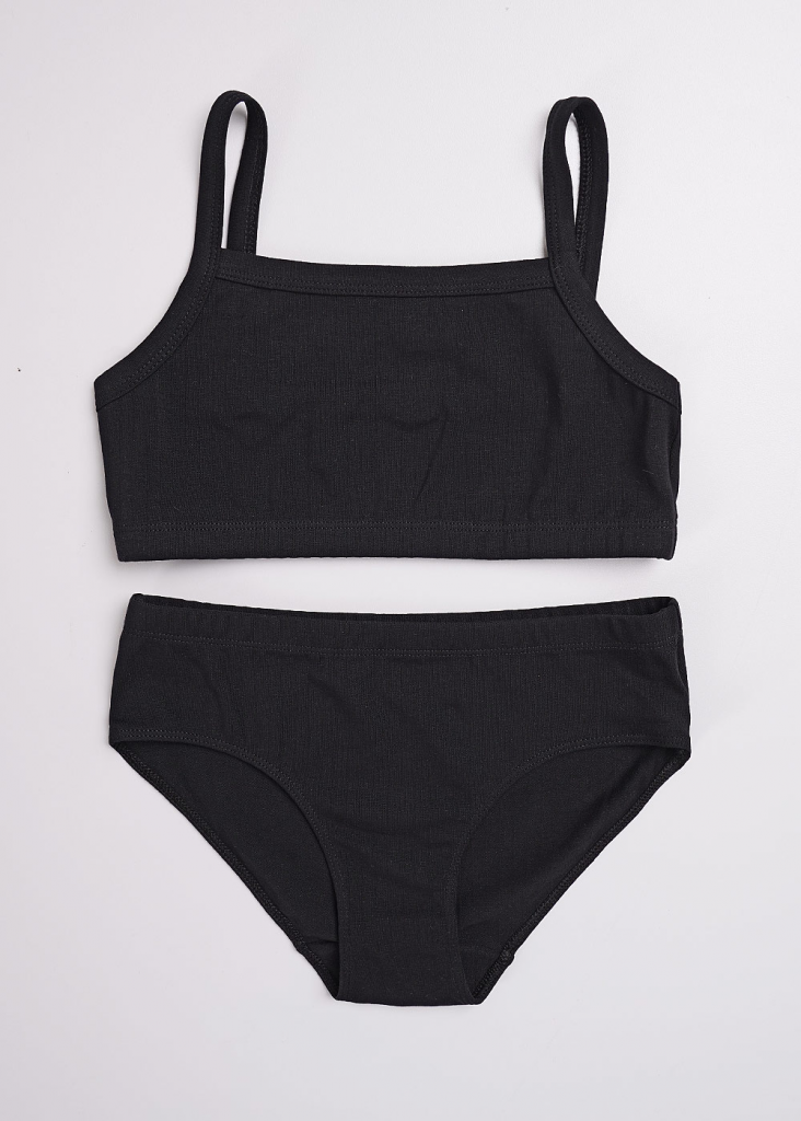 Нежный детский комплект белья в чёрном оттенке: мягкий топ и удобные трусики из приятной хлопковой лапши. Натуральные материалы и продуманный крой обеспечивают идеальную посадку и комфорт в течение всего дня.