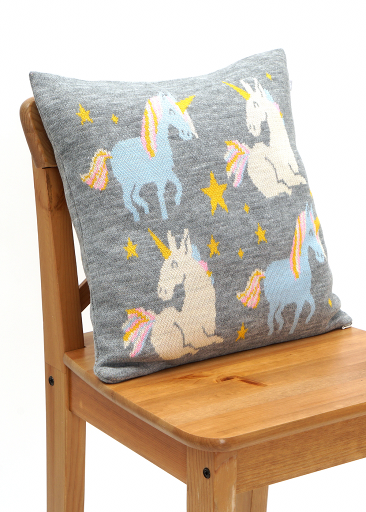Вязаная наволочка с тематическим жаккардовым рисунком с потайной молнией декорирована имиджевой нашивкой