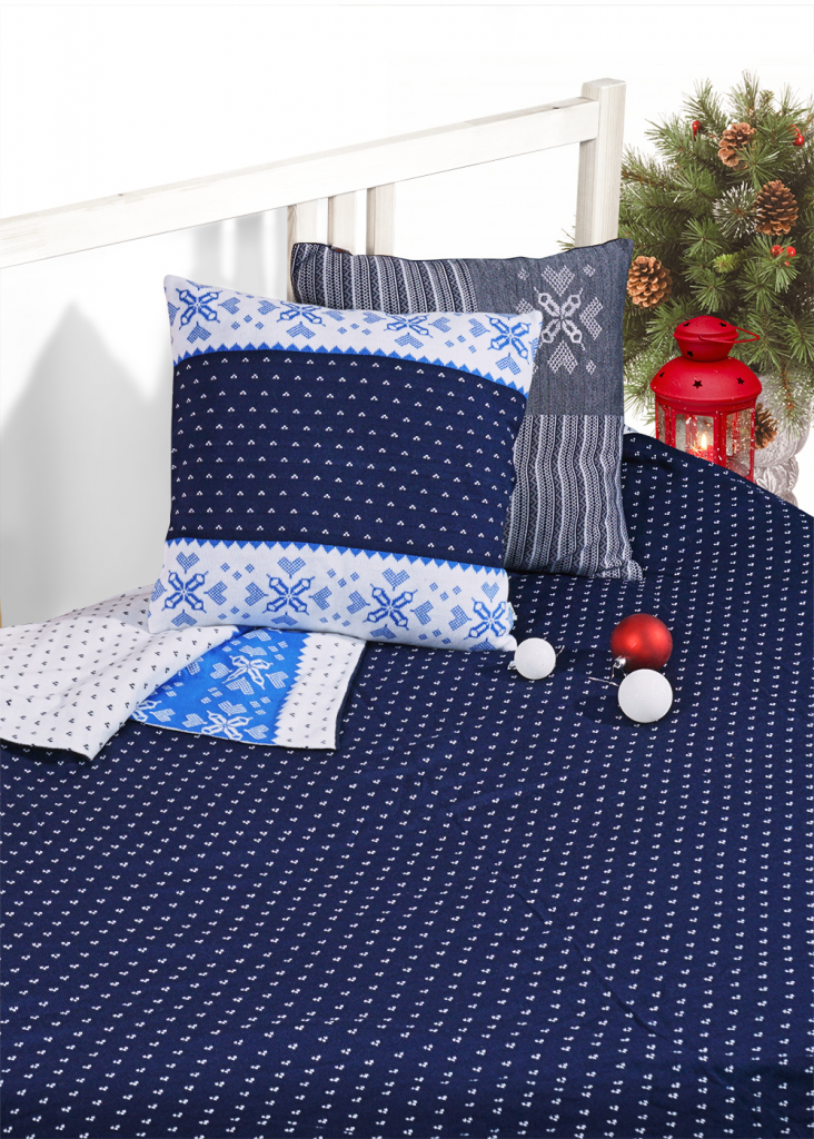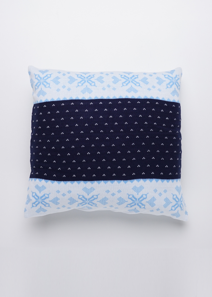 Вязаная наволочка с тематическим зимним узором декорирована тканевой имиджевой вшивкой, с потайной молнией