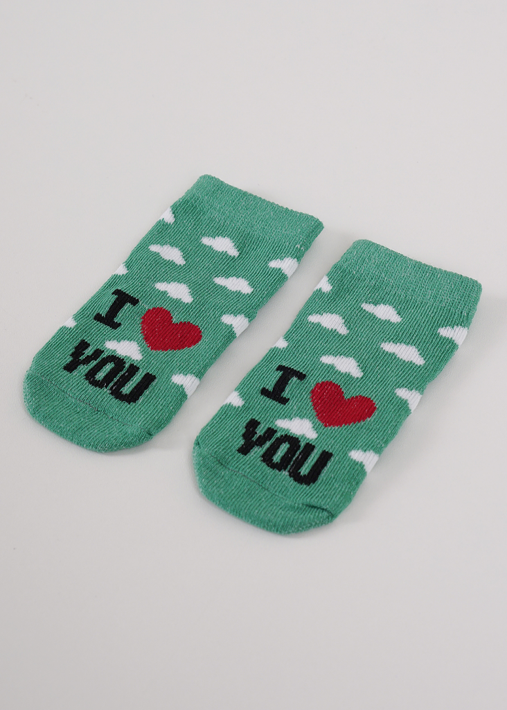 Детские носки для ясельной возрастной группы, розового цвета, с изображением надписи "I LOVE YOU" . Выполнены из мягкого трикотажа, что не вызывает дискомфорта при носке, отлично сидят на ножке. После стирки не дают усадку.