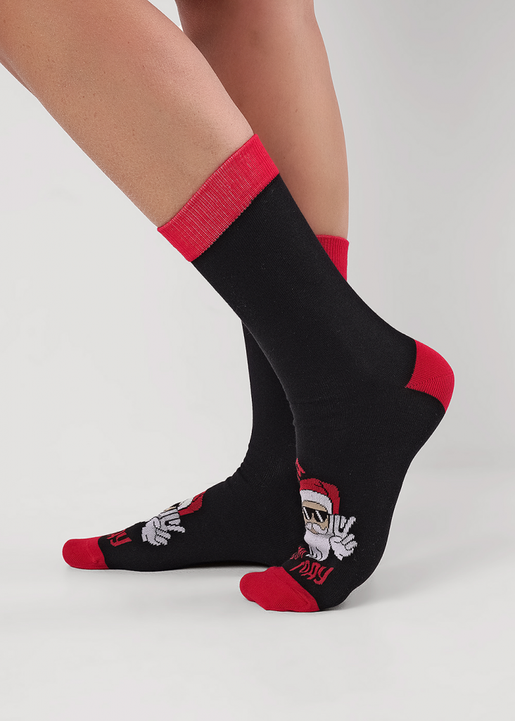 носки мужские с выделенным мыском и пяткой и бортом , с рисунком лицо деда мороза и надписью удачи в новом году