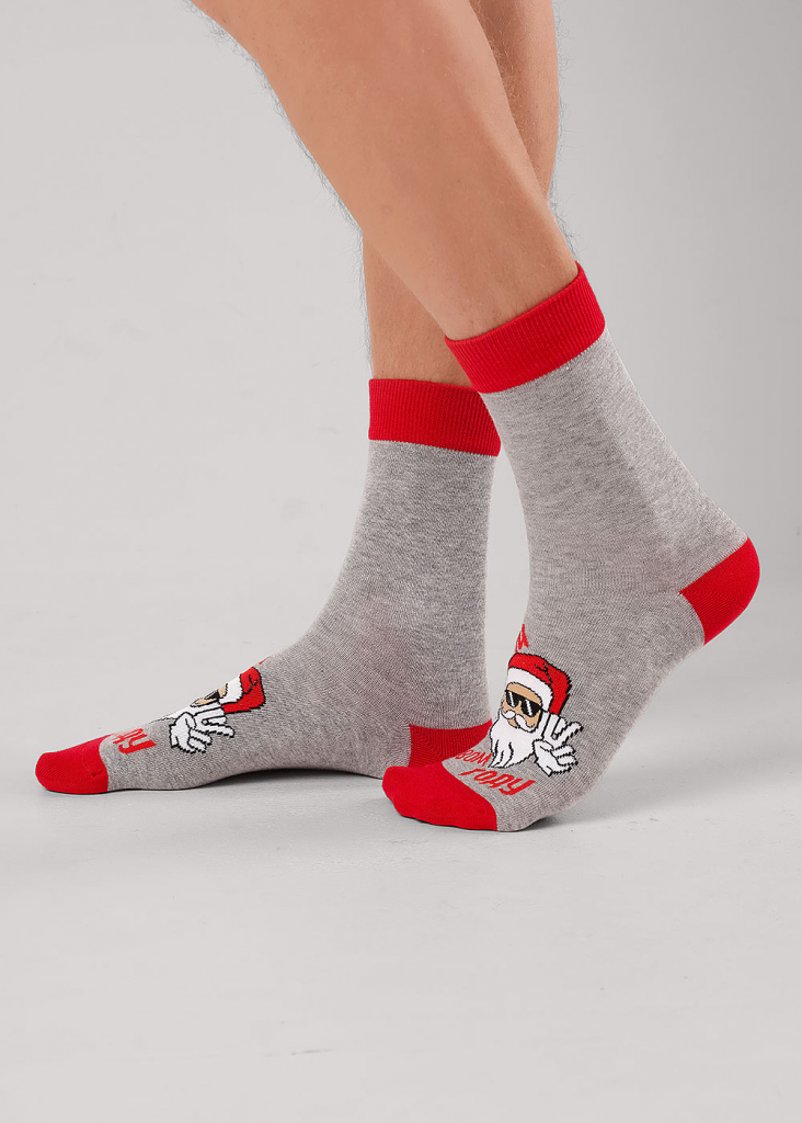 носки мужские с выделенным мыском и пяткой и бортом , с рисунком лицо деда мороза и надписью удачи в новом году
