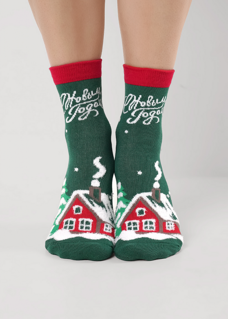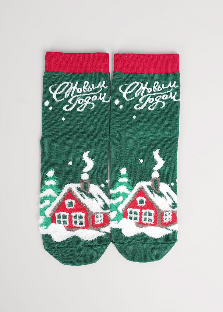 Носки женские с рисунком дом в зимнем лесу, снег выполнен из пряжи травка, и надписью С Новым годом!
