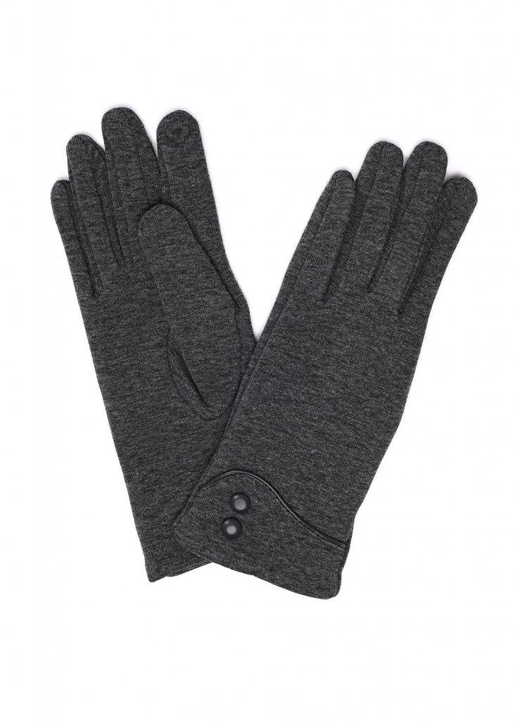 Женские перчатки из трикотажного полотна имитирующего внутри искусственный мех, декорированы кожанной окантовкой и пуговицами, на большом и указательном пальцах вышивка "сенсорными" нитками, размер 18.