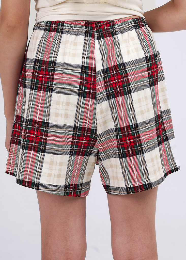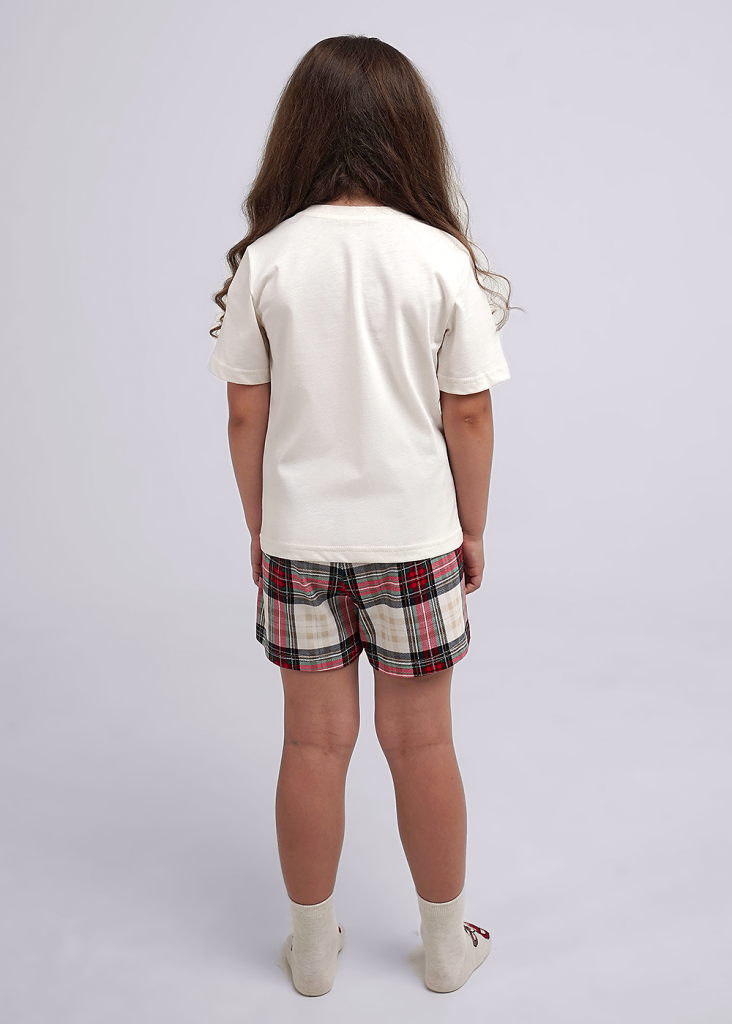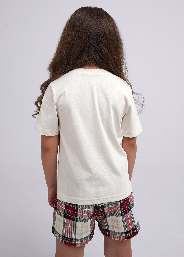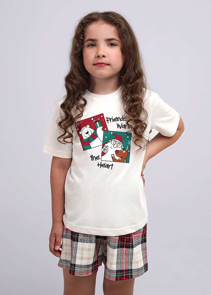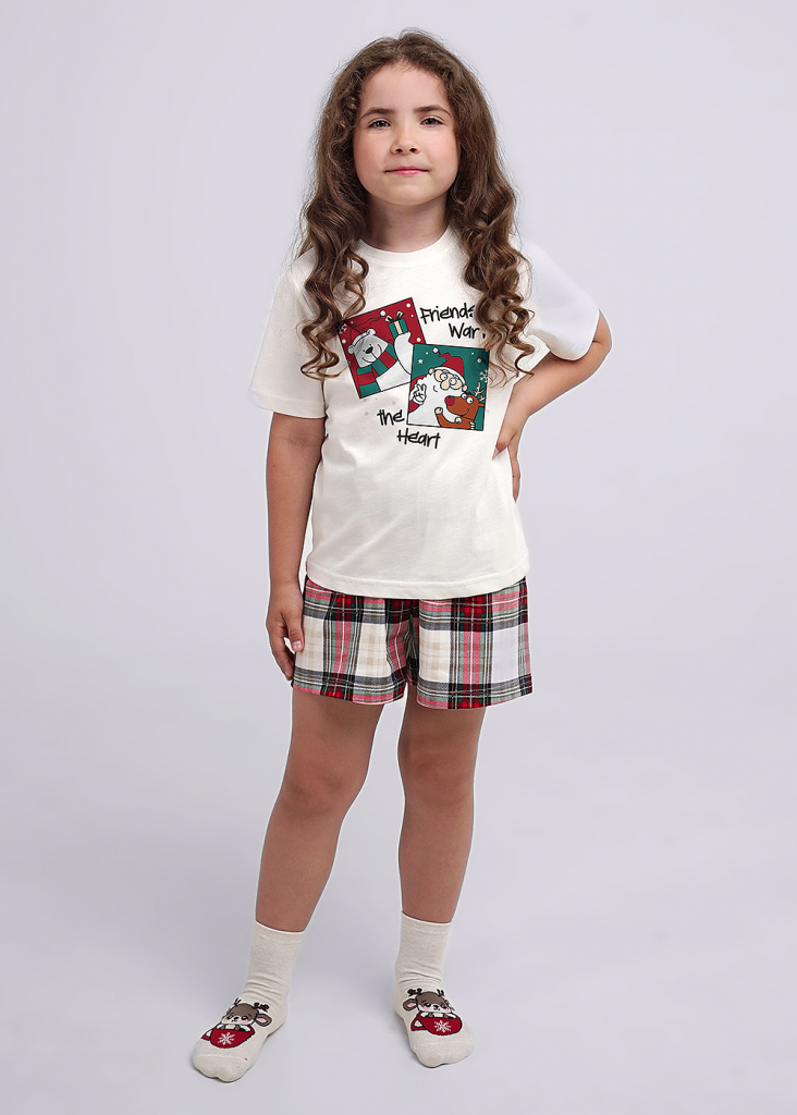 Новогодняя хлопковая пижама,состоящая из футболки и шорт. Футболка свободного кроя спереди украшена милым тематическим принтом. Шорты с высокой талией, эластичный пояс обеспечит комфорт и идеальную посадку.
