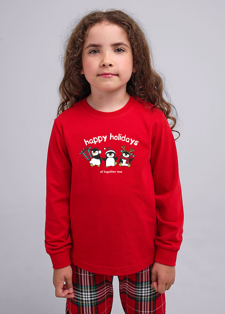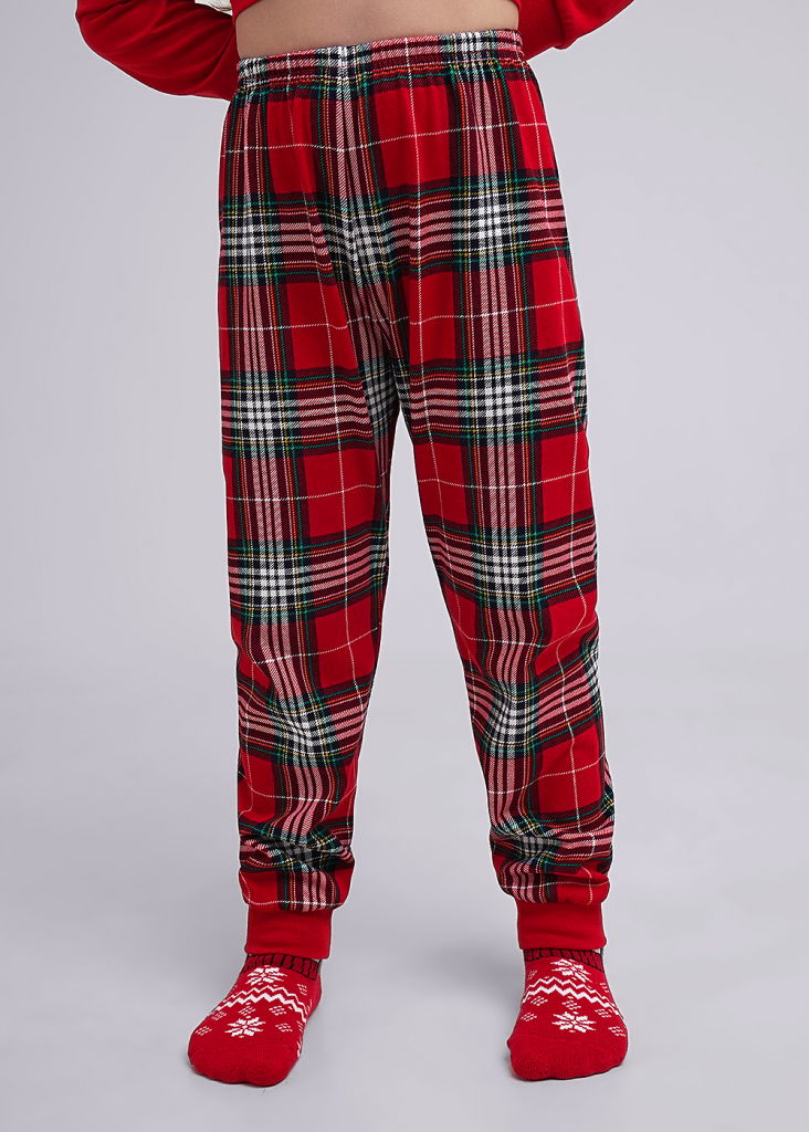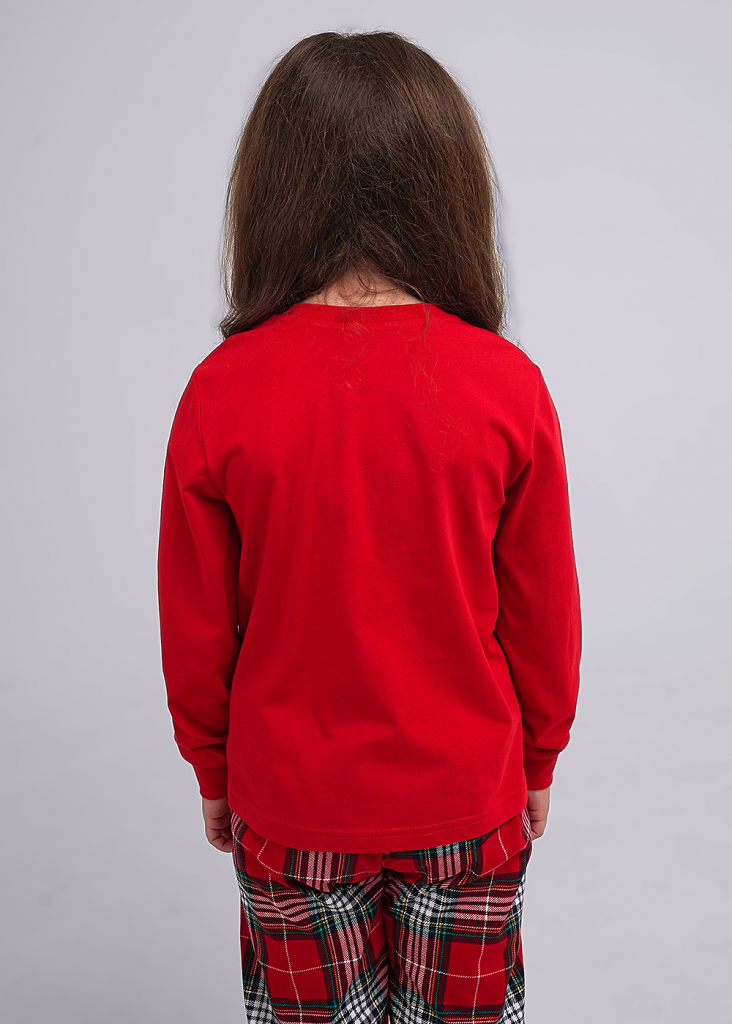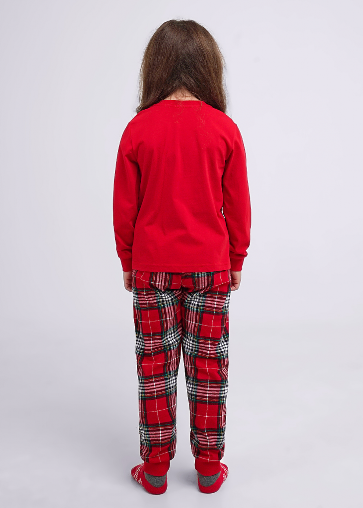 Новогодняя хлопковая пижама из джемпера и брюк. Горловина , манжеты по низу рукава и брюк из эластичного полотна. Лонгслив свободного кроя со спущенным плечом и милым принтом. Брюки среднего объема, эластичный пояс обеспечит комфорт и идеальную посадку.