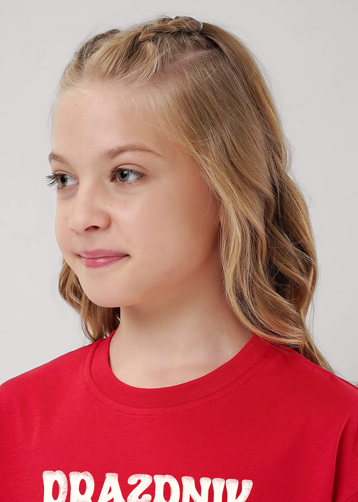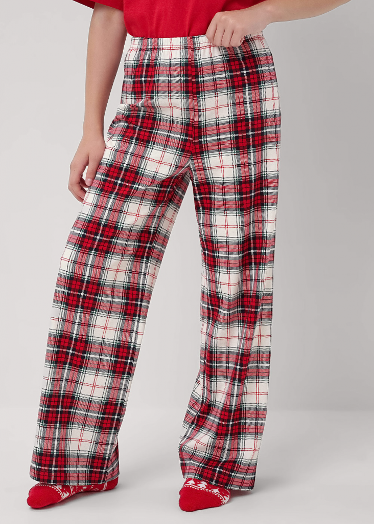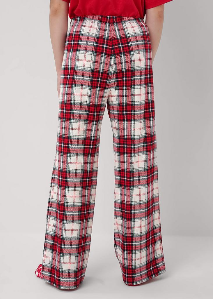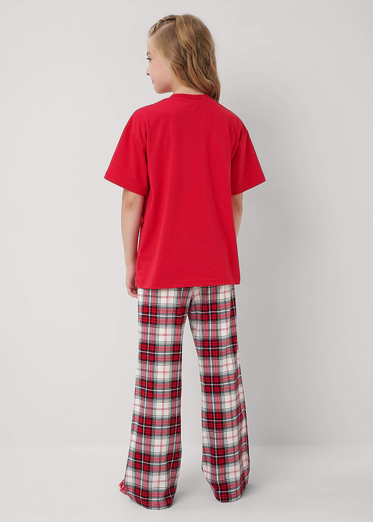 Новогодняя пижама для подростков,состоящая из футболки и брюк. Футболка свободного кроя спереди украшена милым тематическим принтом. Брюки прямые среднего объема с эластичным поясом.