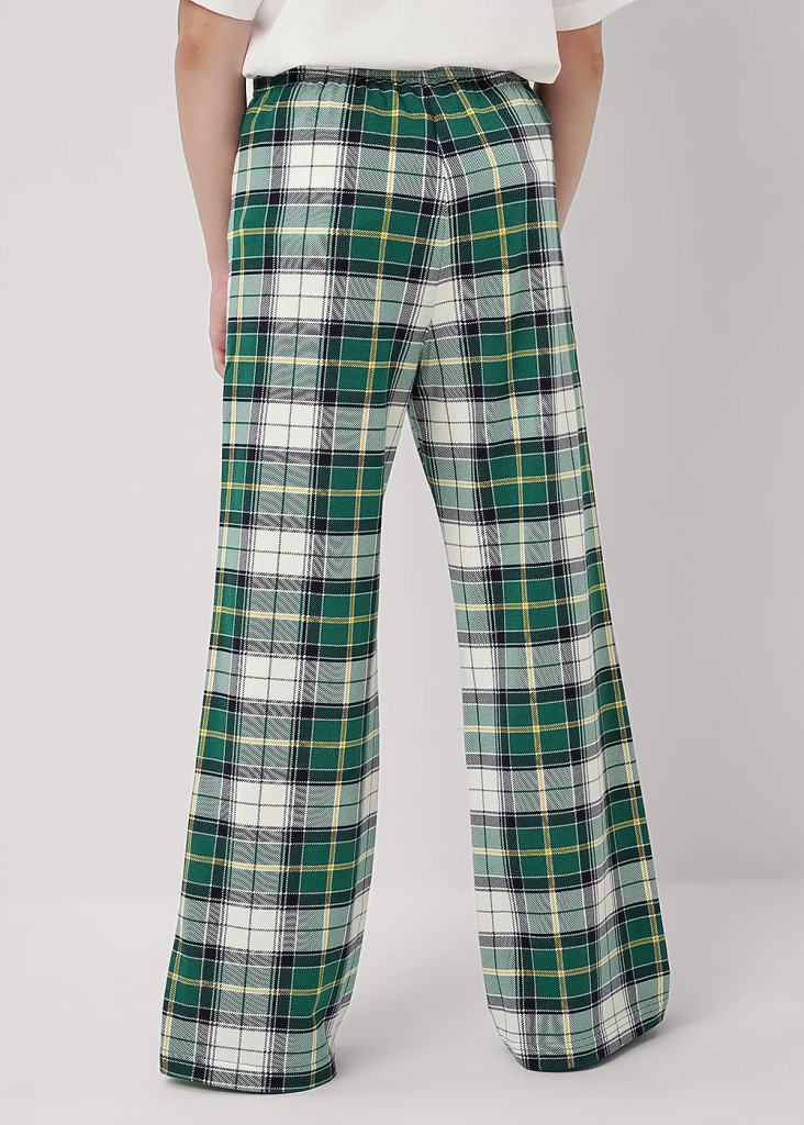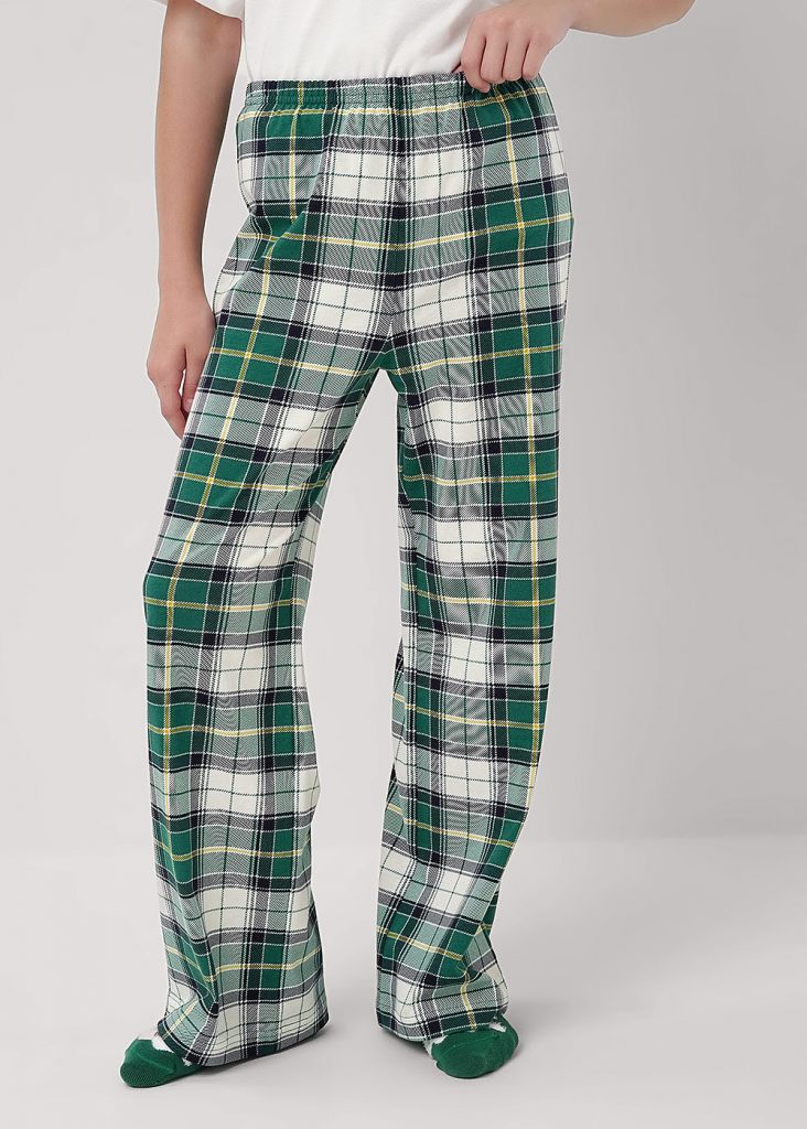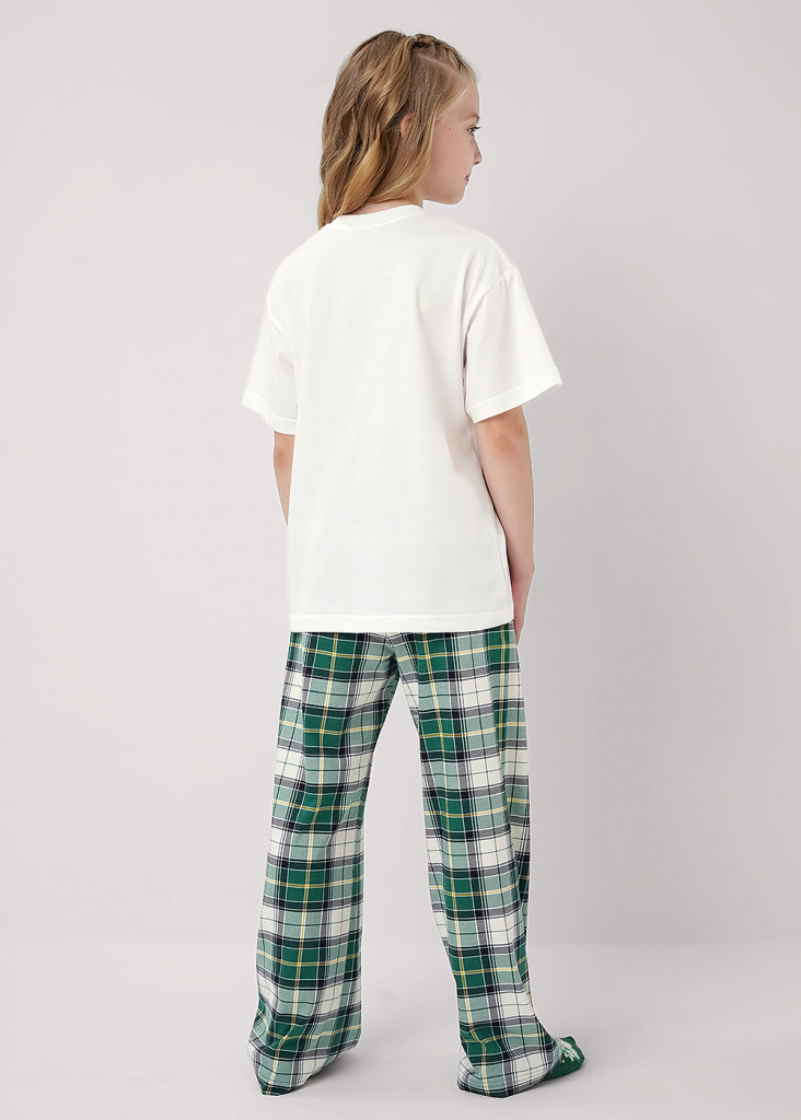 Новогодняя пижама для подростков,состоящая из футболки и брюк. Футболка свободного кроя спереди украшена милым тематическим принтом. Брюки прямые среднего объема с эластичным поясом.