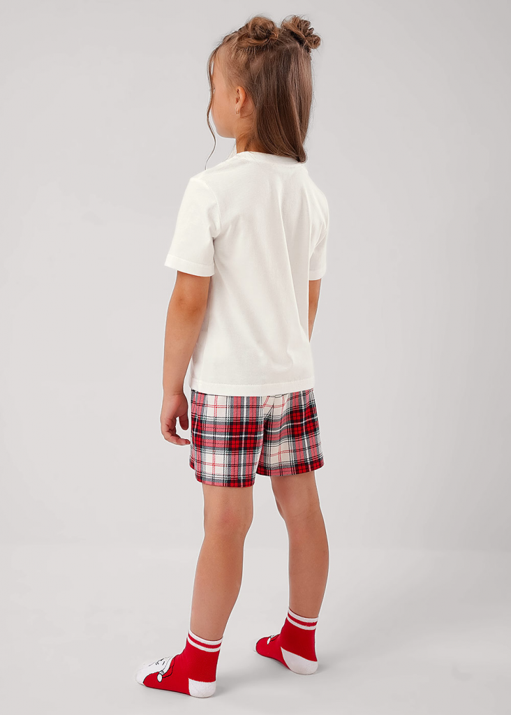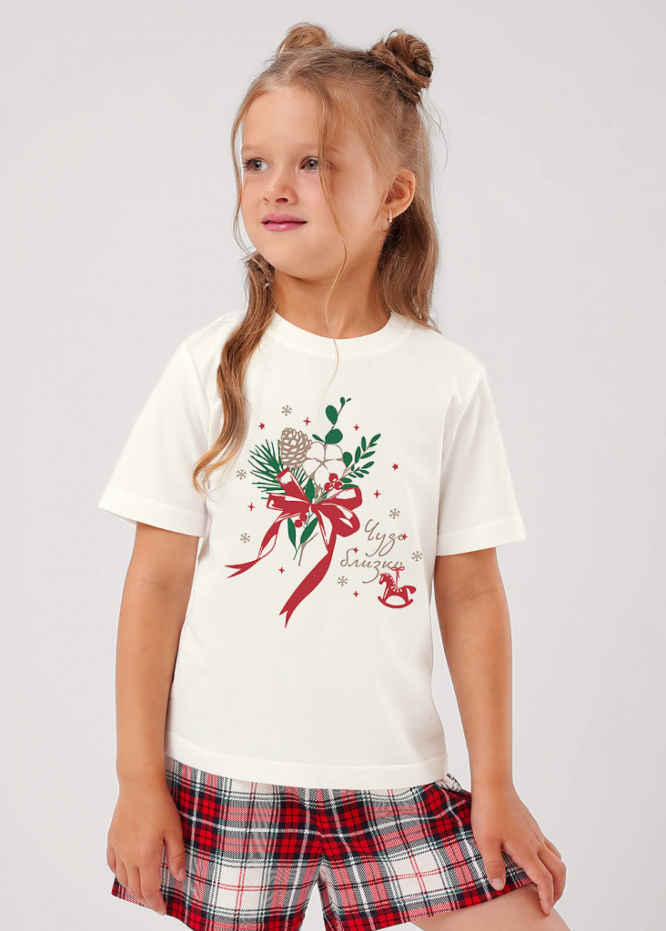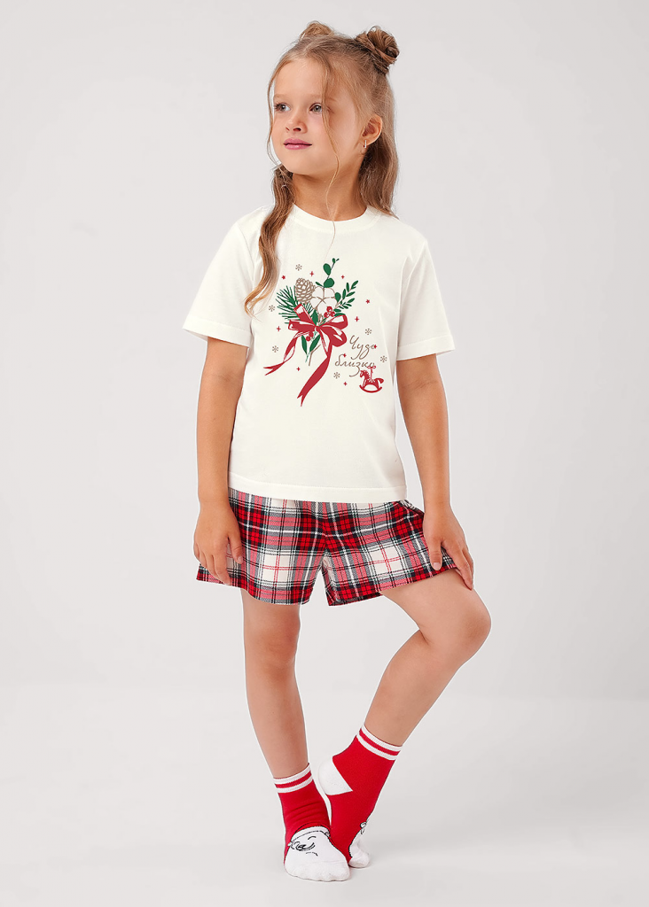 Новогодняя хлопковая пижама,состоящая из футболки и шорт. Футболка свободного кроя спереди украшена милым тематическим принтом. Шорты с высокой талией, эластичный пояс обеспечит комфорт и идеальную посадку.