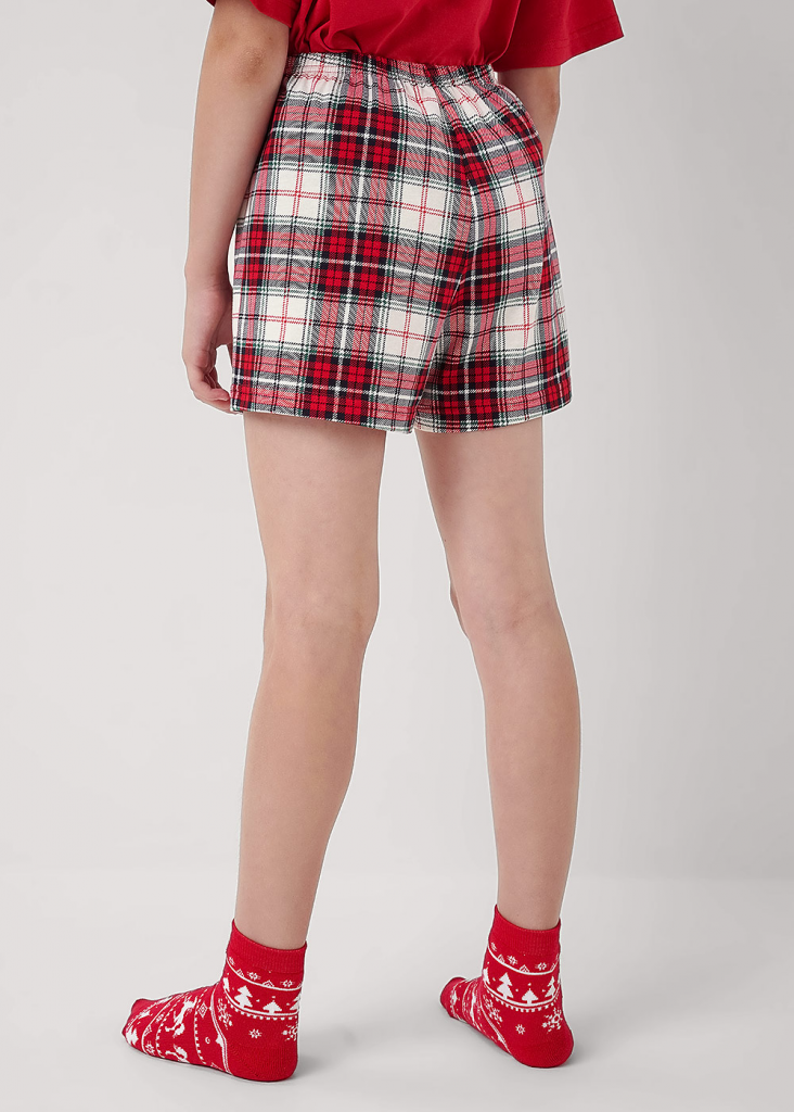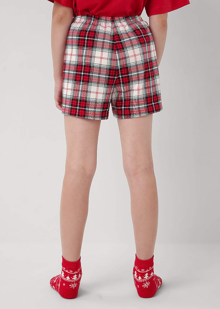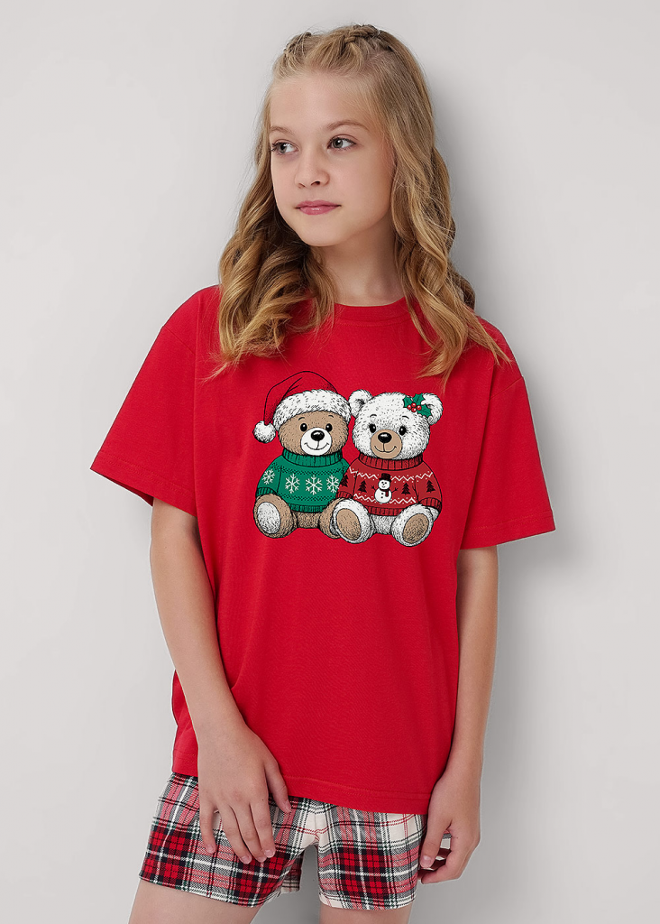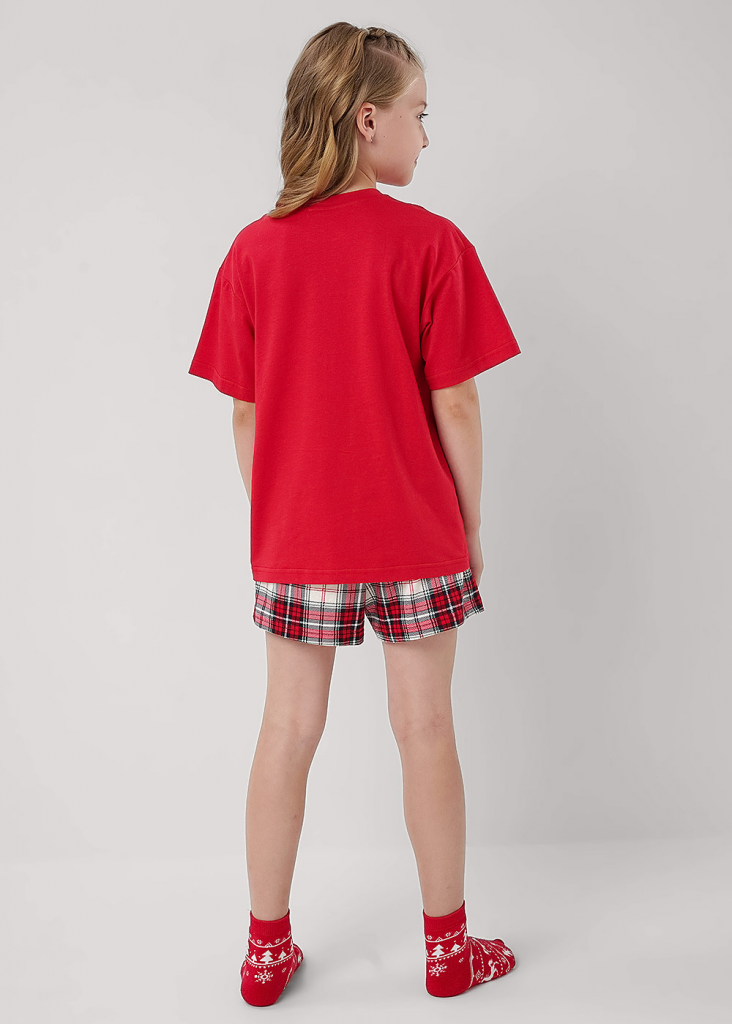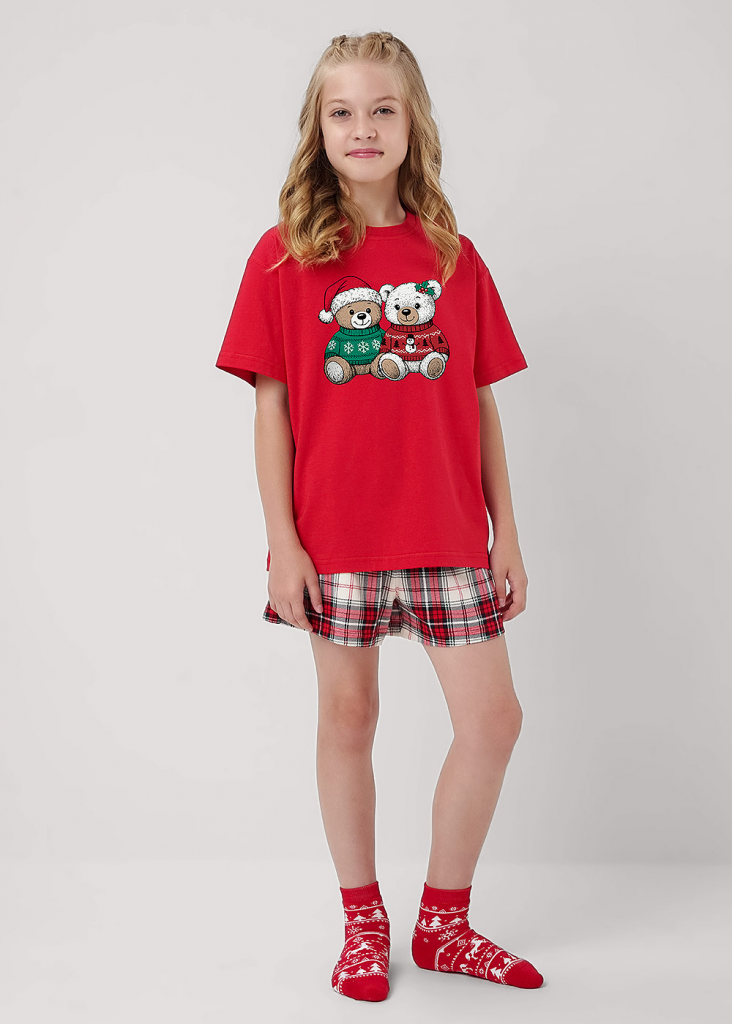 Новогодняя хлопковая пижама,состоящая из футболки и шорт. Футболка свободного кроя спереди украшена милым тематическим принтом. Шорты с высокой талией, эластичный пояс обеспечит комфорт и идеальную посадку.
