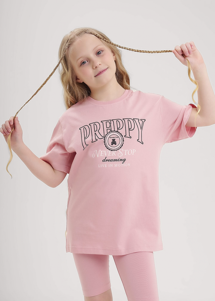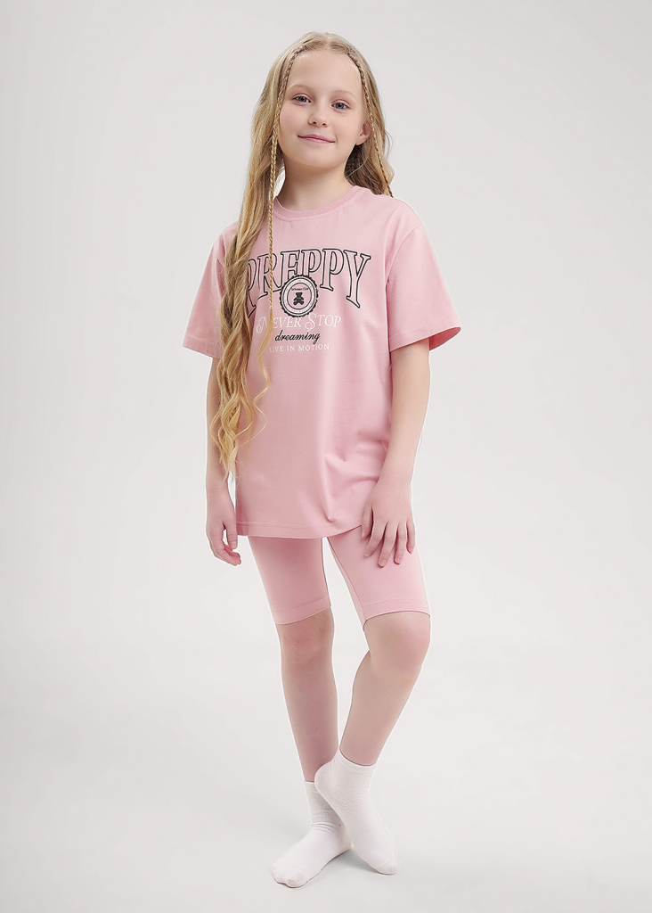 Комплект домашней пижамы из велосипедок и футболки. Футболка свободного кроя дополнена эластичной горловиной и стильным принтом. Велосипедки дополнены эластичным поясом для большего удобства.