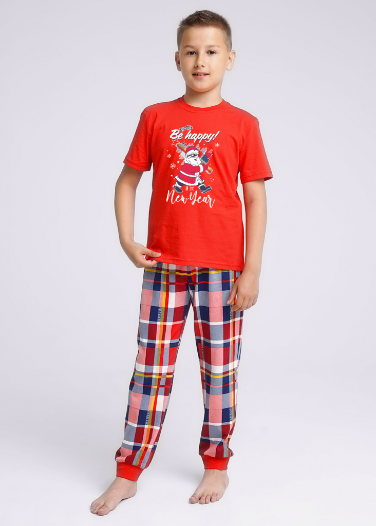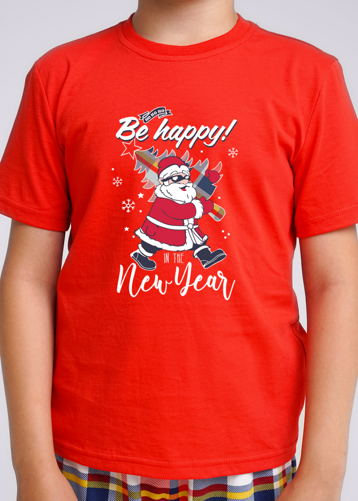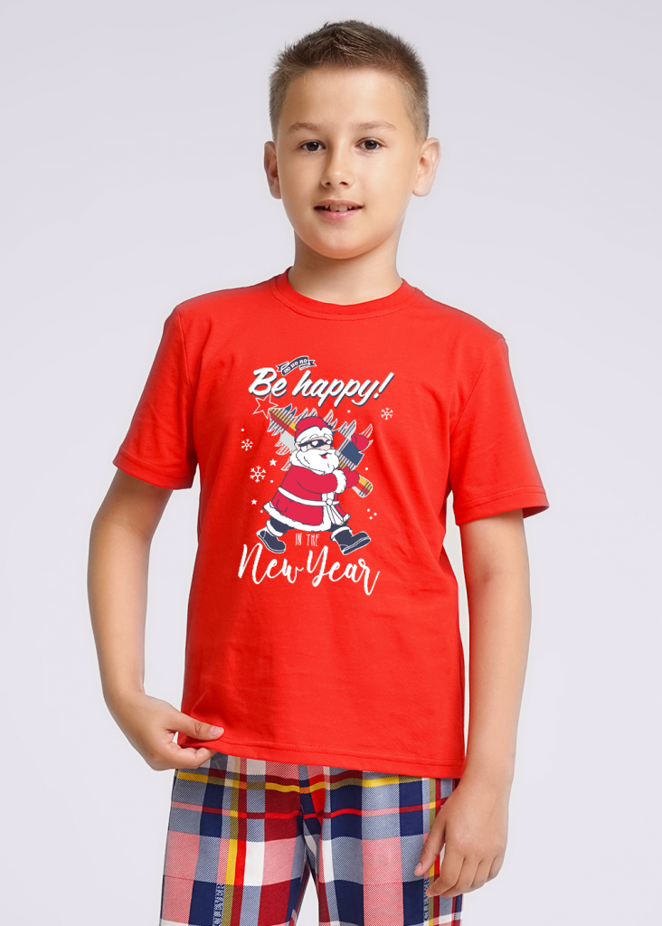 Комплект из свободной футболки и брюк. Футболка с заниженной линией плеч, спереди новогодний принт. Брюки среднего объема по низу эластичный манжет.