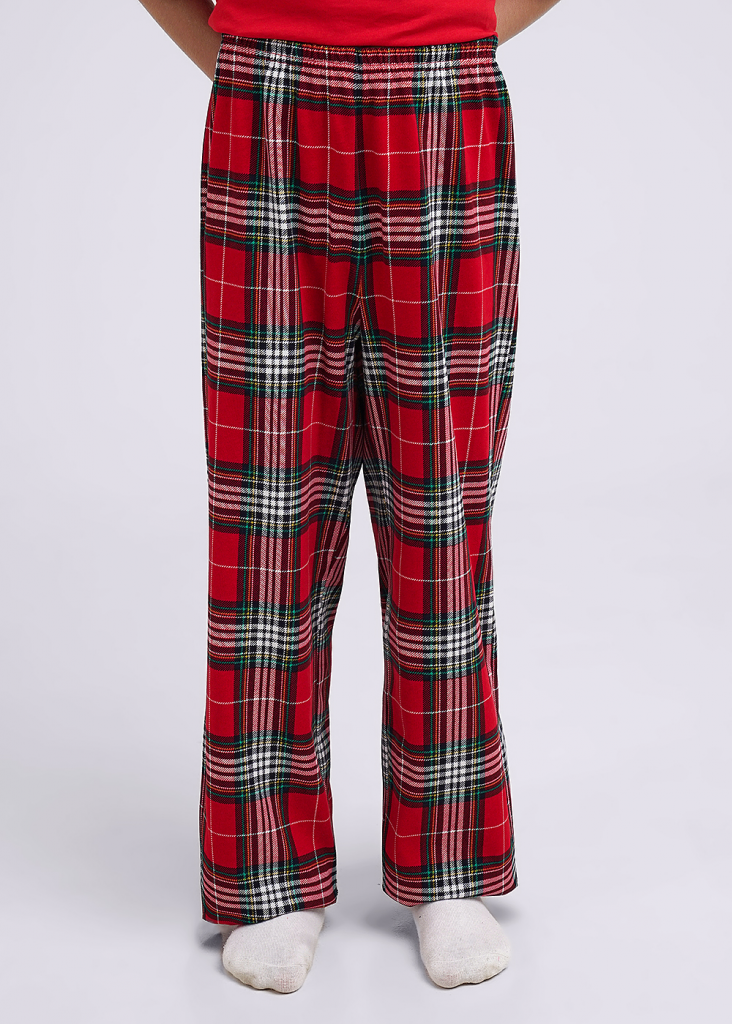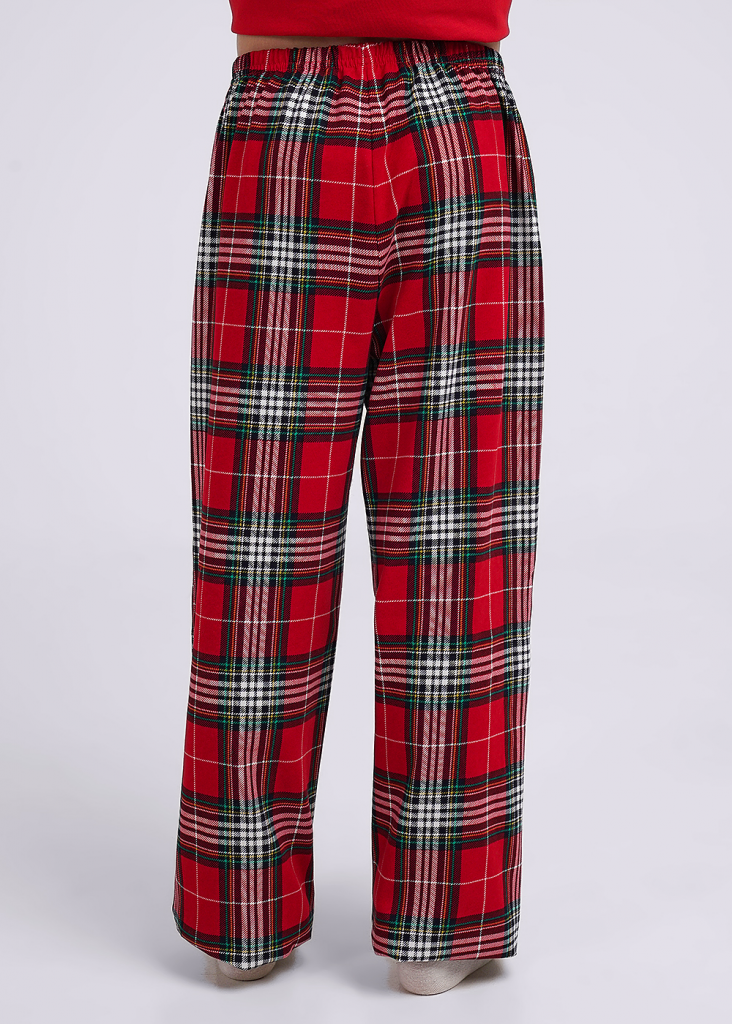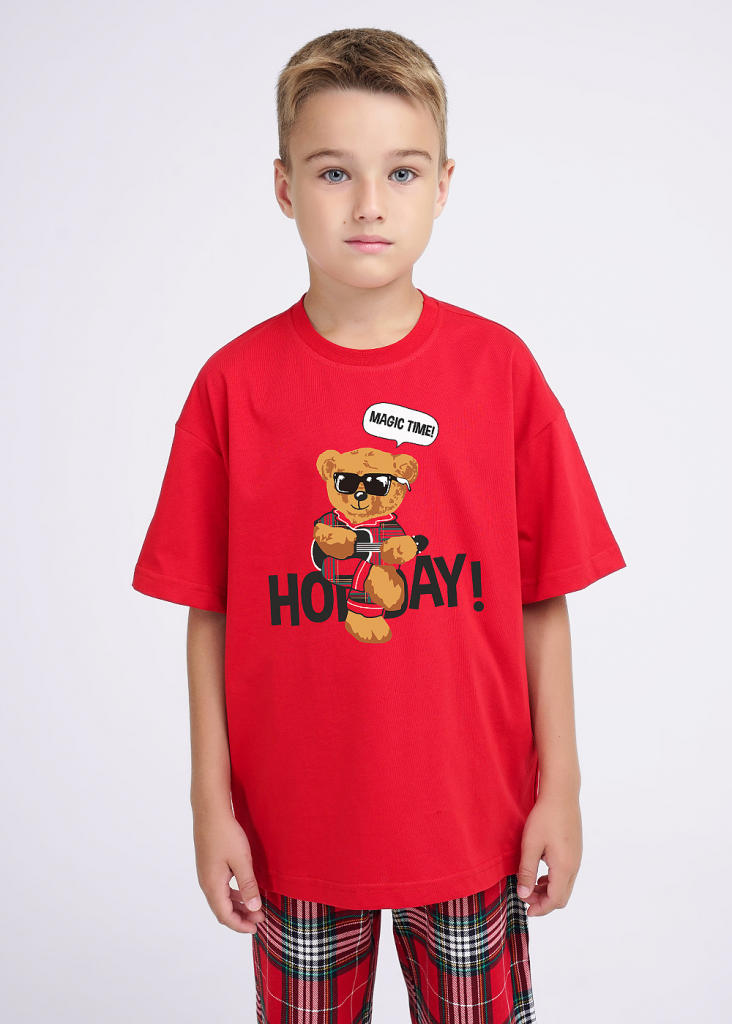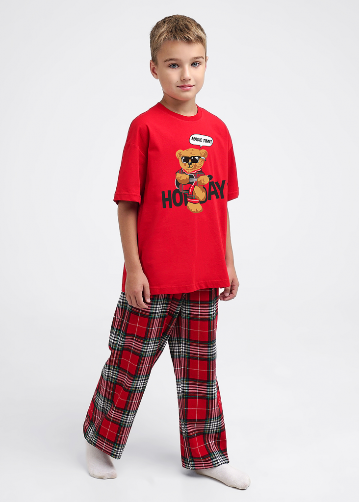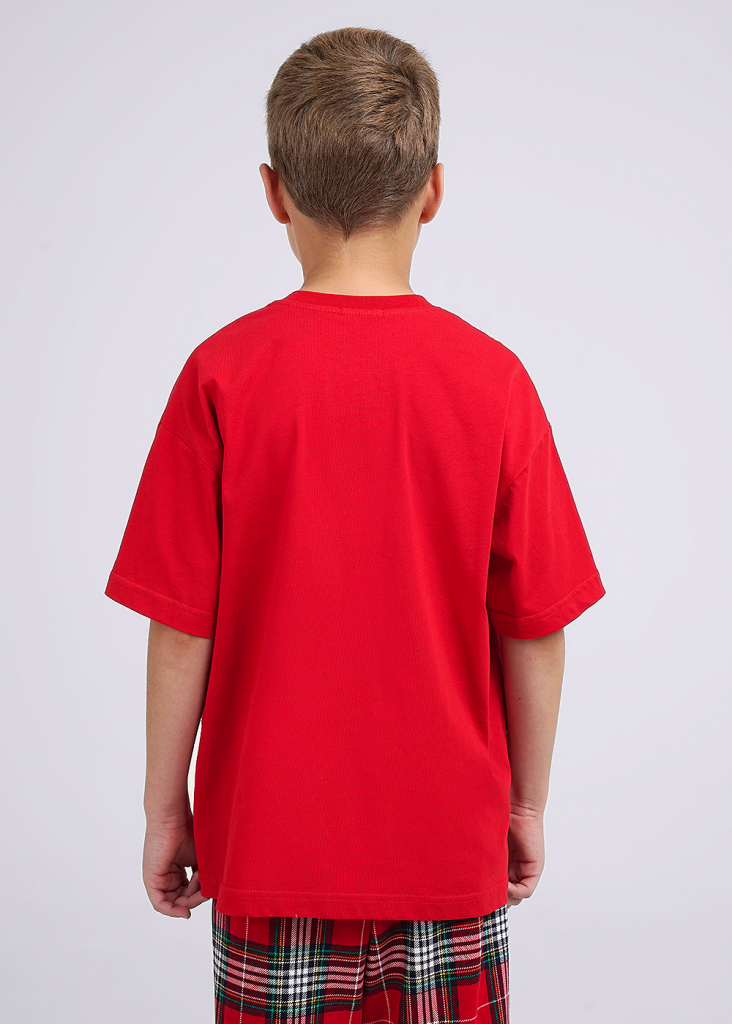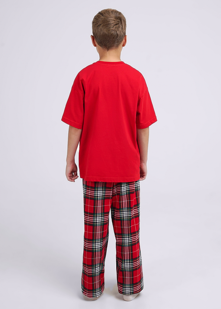 Стильная новогодняя пижама,состоящая из футболки и брюк. Футболка свободного кроя спереди украшена оригинальным тематическим принтом. Брюки прямые выполнены из хлопкового полотна в клетку.