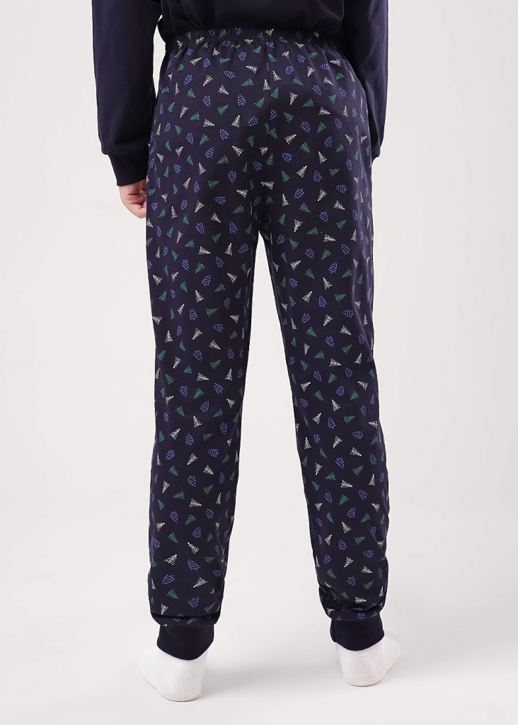 Новогодняя хлопковая пижама из джемпера и брюк. Горловина , манжеты по низу рукава и брюк из эластичного полотна. Лонгслив свободного кроя со спущенным плечом и крутым принтом.Брюки среднего объема, эластичный пояс обеспечит комфорт и идеальную посадку.