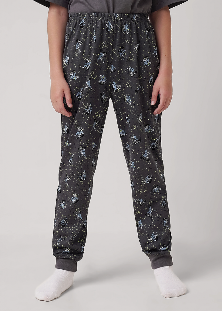 Комплект хлопковой пижамы из футболки и брюк. Футболка свободного кроя дополнена эластичной горловиной и стильным принтом. Брюки среднего объема, эластичный пояс обеспечит комфорт и идеальную посадку. По низу брюк эластичные манжеты.