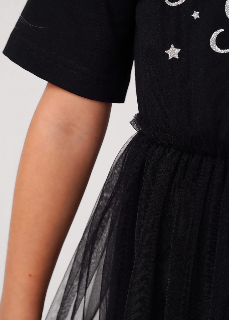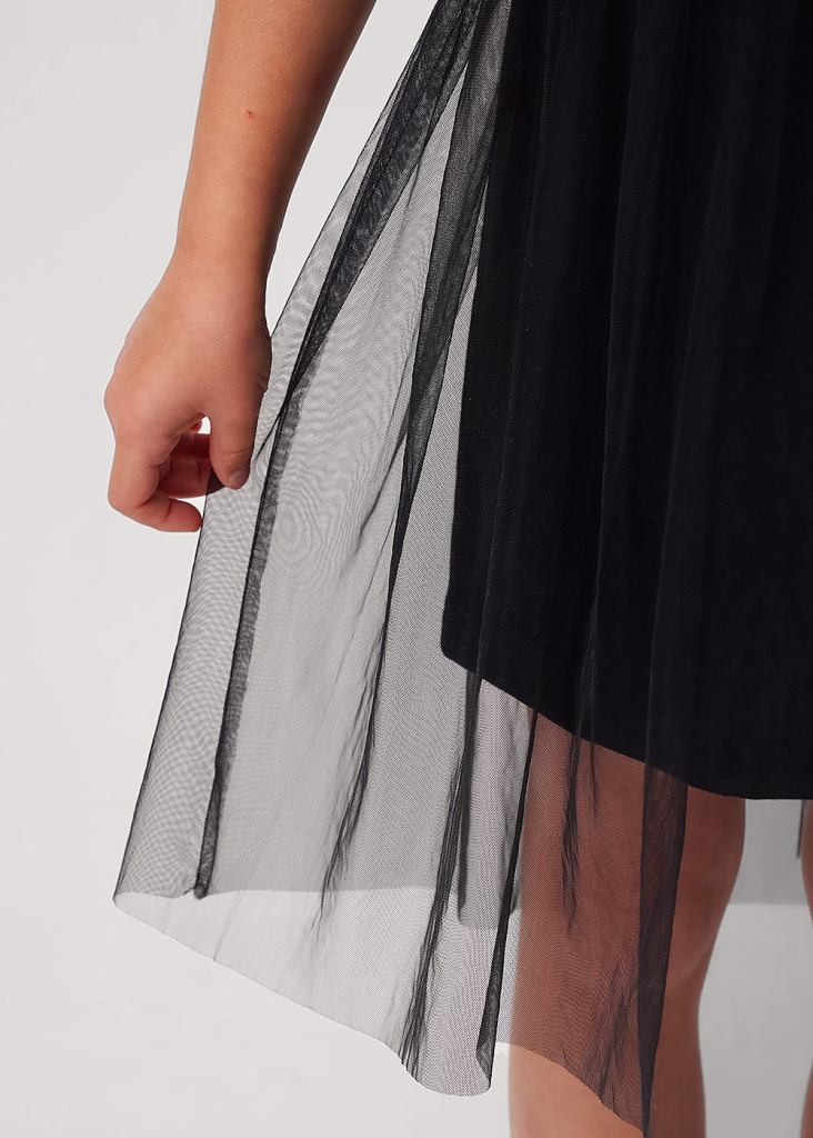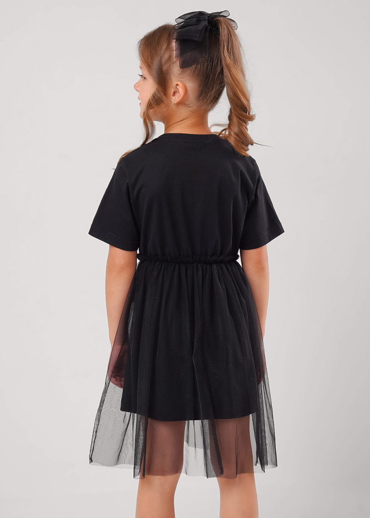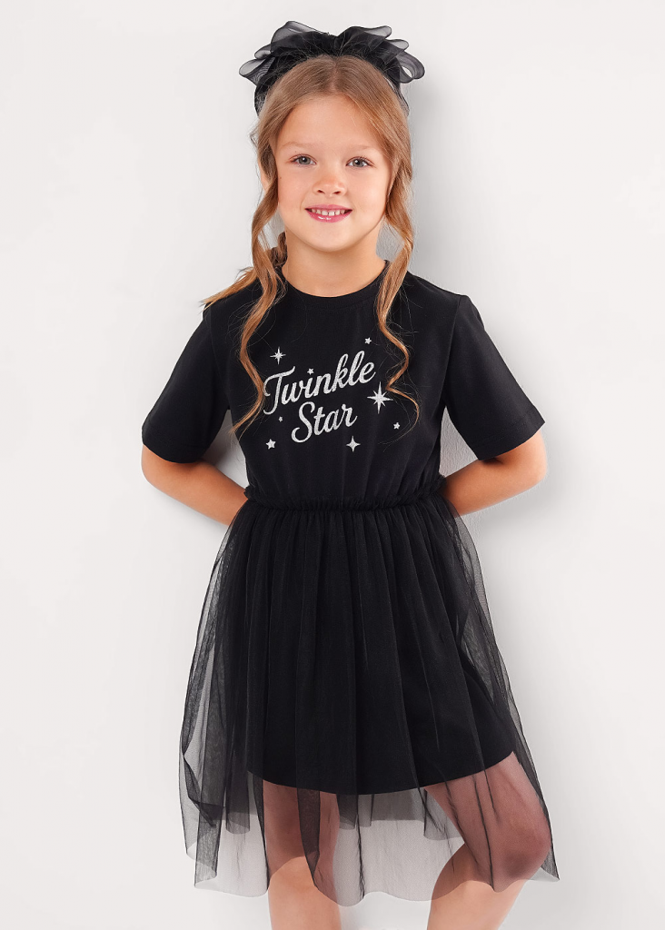 Нарядное платье с сеткой абсолютная находка для юных модниц! Пышная юбка из сетки,короткий летящий рукав,и подклад платья - из хлопка с эластаном. Платье дополнено мерцающим принтом спереди.