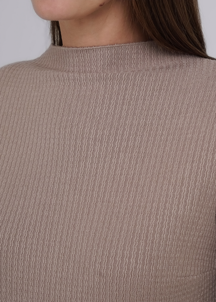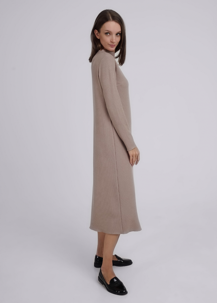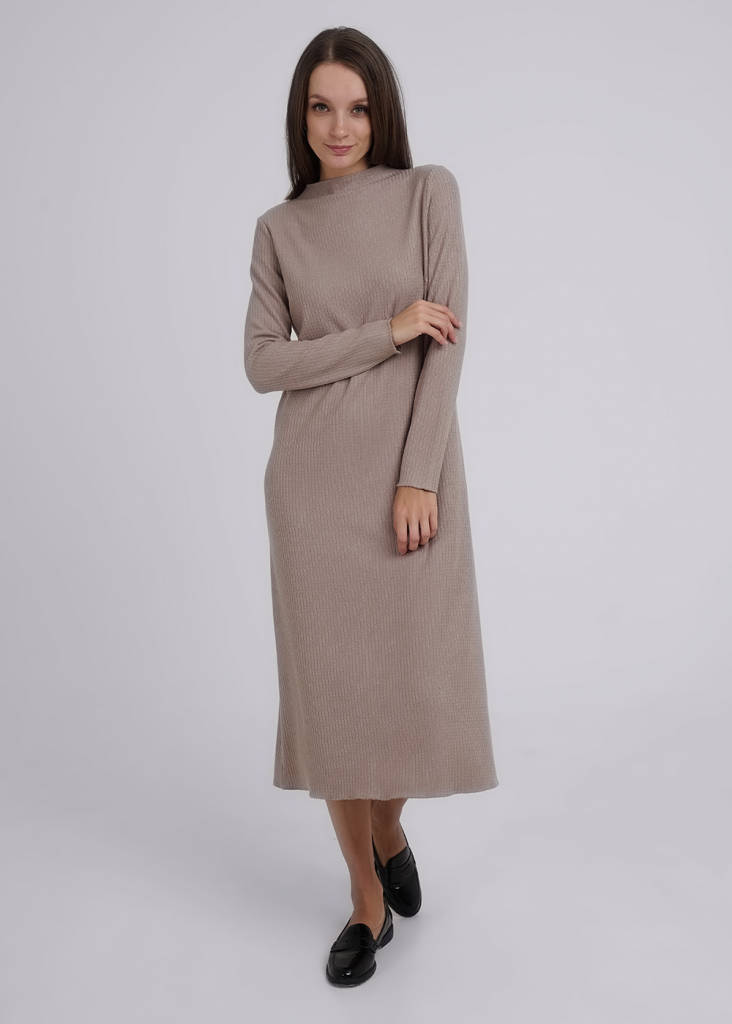 Платье из фактурного трикотажного поливискозного вязаного полотна. Прямого силуэта, длиной до колена. Динный втачной рукав. По горловине цельвыкроенная стойка. Сзади по спинке средний шов. По горловине, низу рукава и низу изделия обработка мелкий оверлок