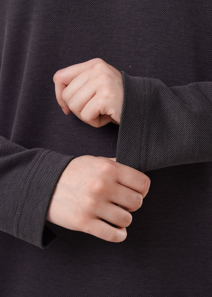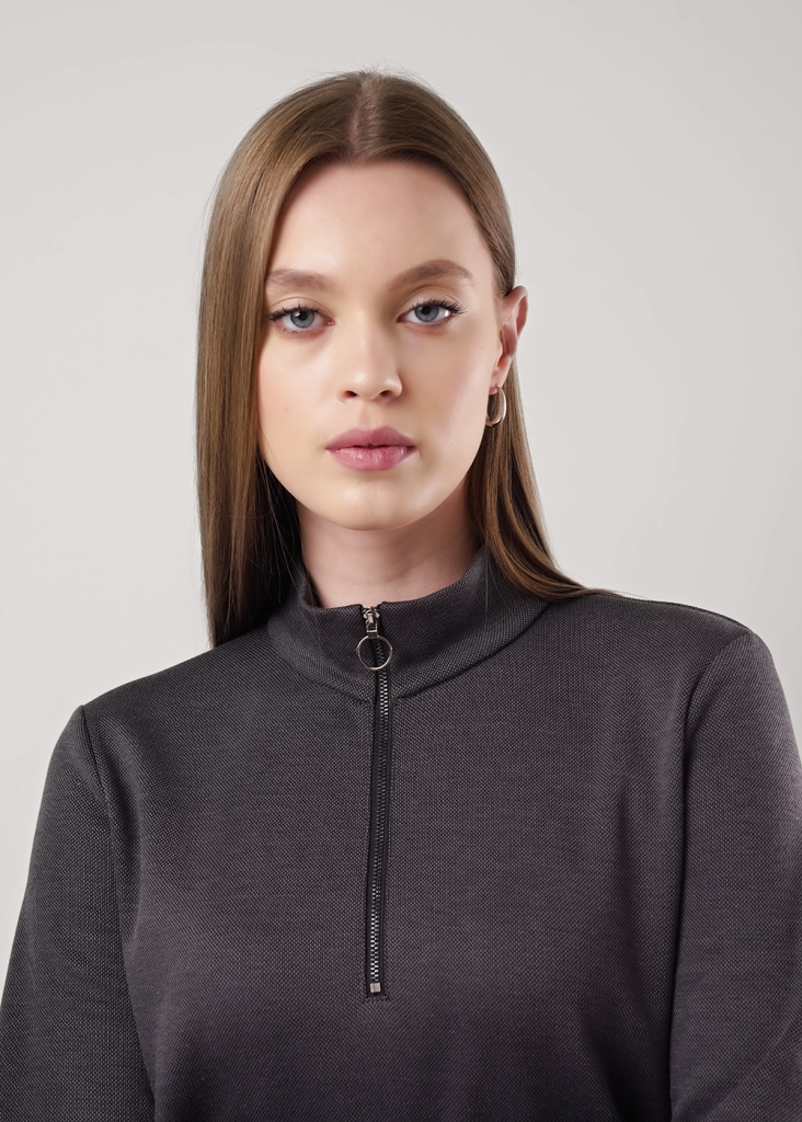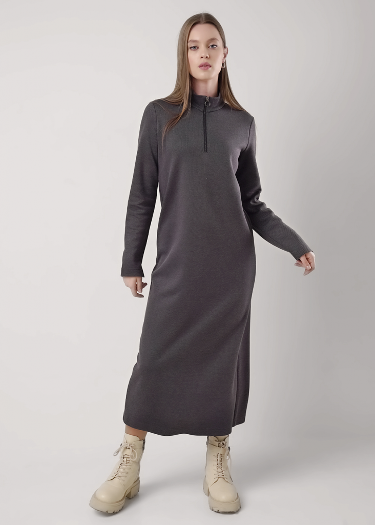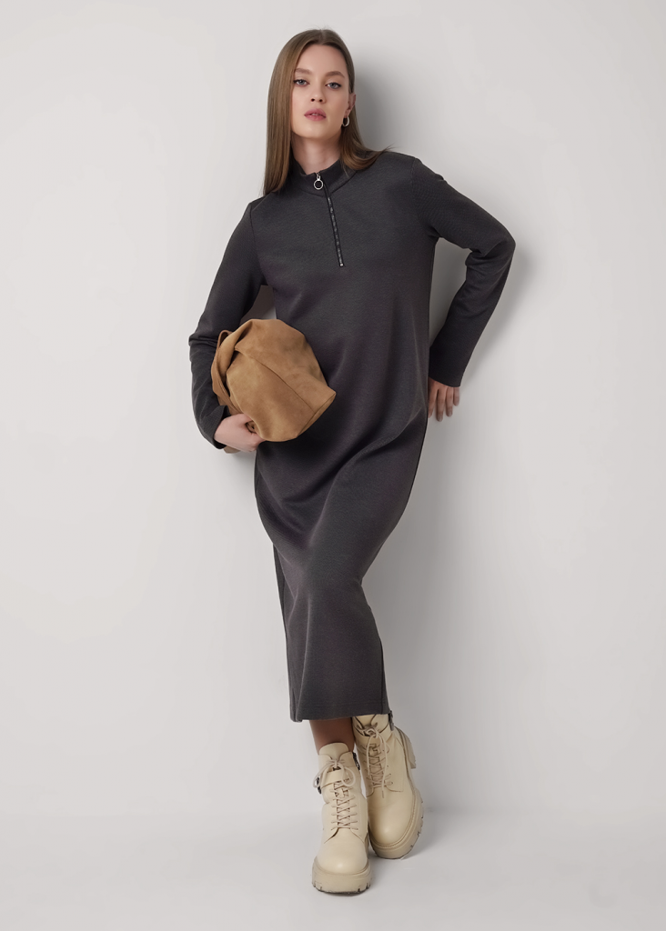 Платье из трикотажного полотна интерлок жаккард, прямого силуэта длиной ниже колена. По горловине стойка, спереди на молниии. Длинный втачной рукав. По спинке средний шов, внизу разрез.