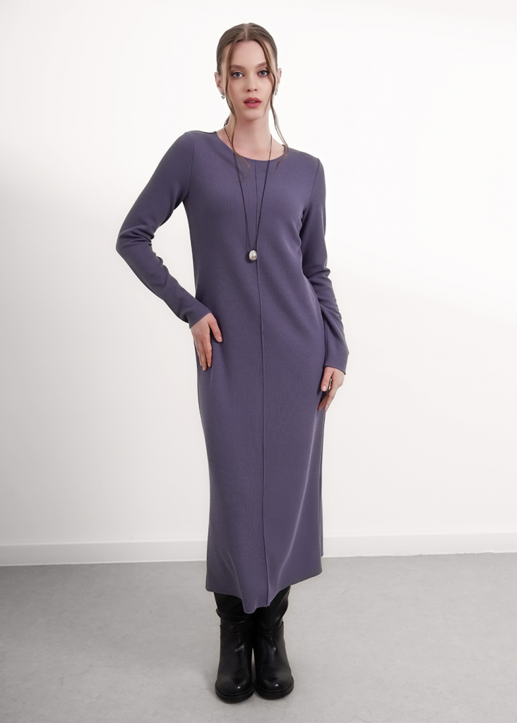 Платье миди из трикотажного полотна силаник, прямого кроя. Округлая горловина. Длинный втачной рукав. По переду вертикальный защип, по спинке средний шов. По низу рукава и изделия мелкий оверлок.