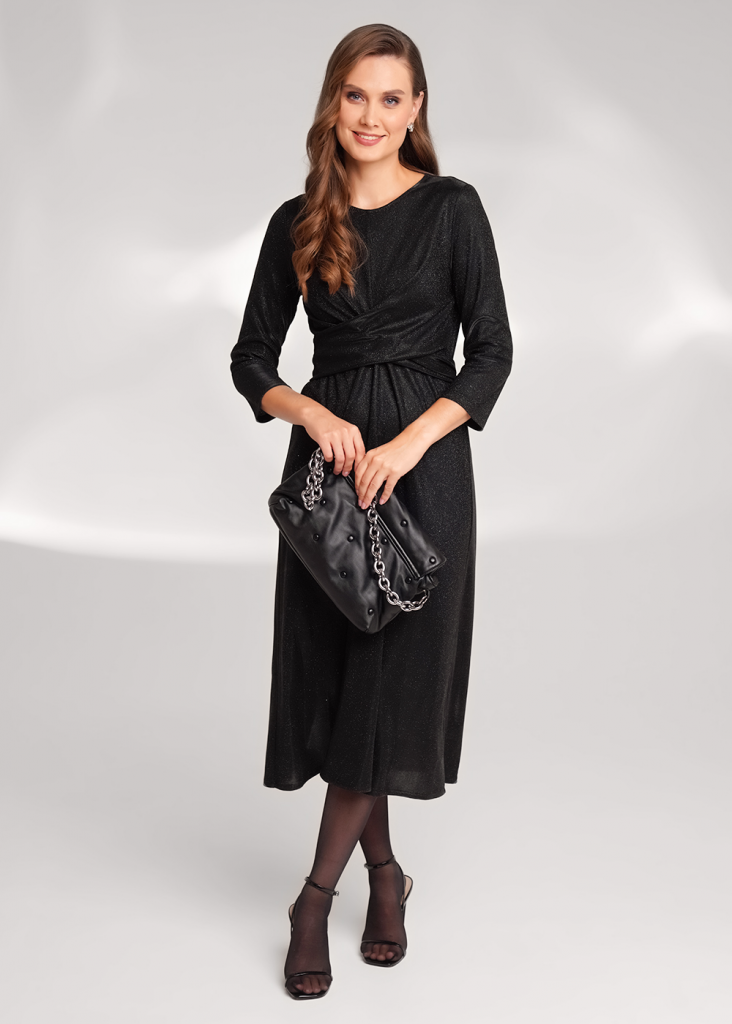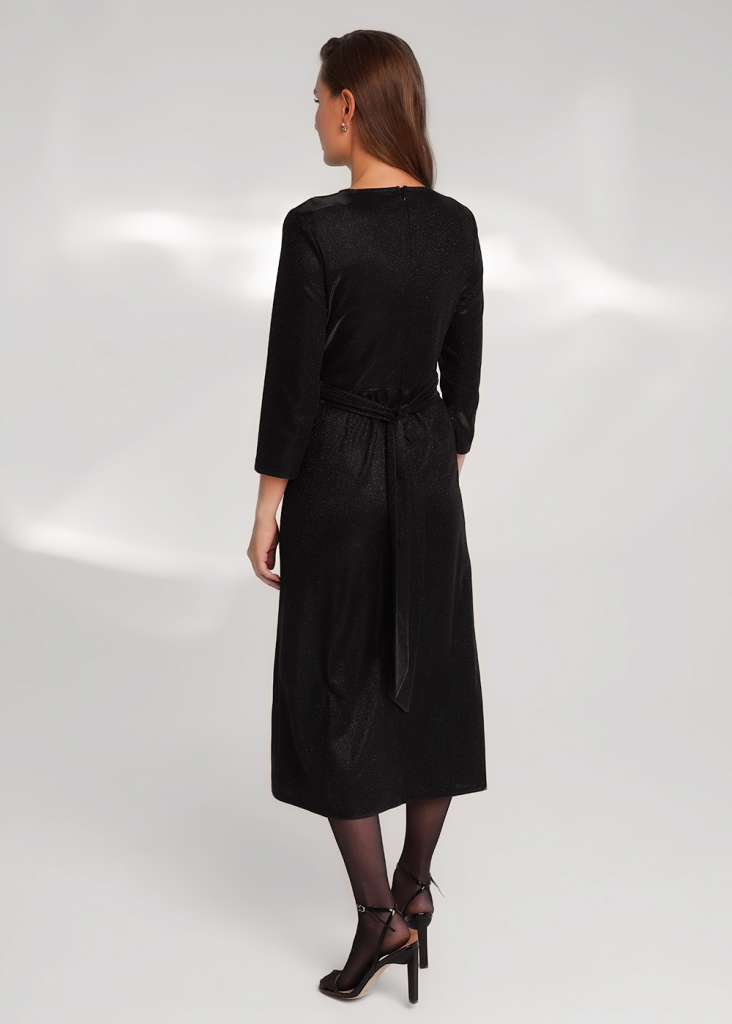 Платье из трикотажного полотна с блеском. Втачной рукав длиной 7/8. Округлая горловина. По переду средний шов до талии с имитацией запаха по груди, переходящая на спинку в завязки. По спинке рез по линии талии и средний шов с застежкой на молнию.