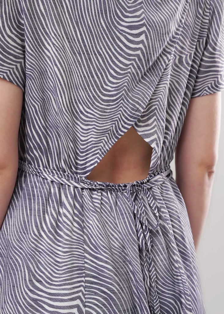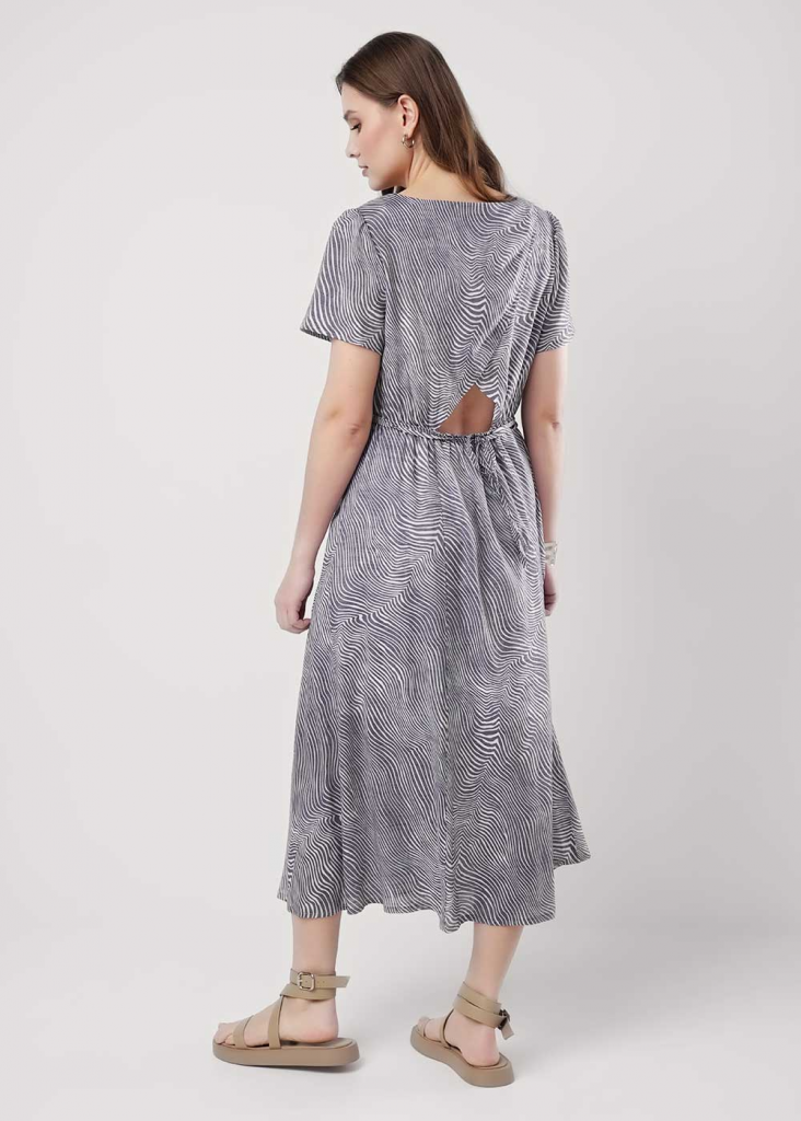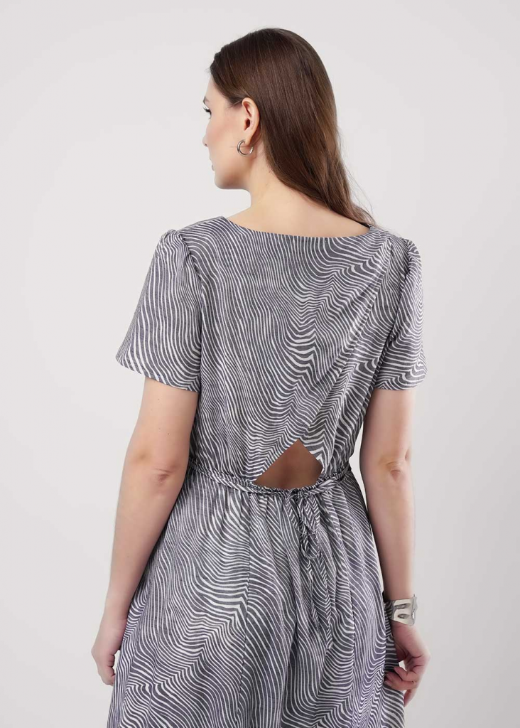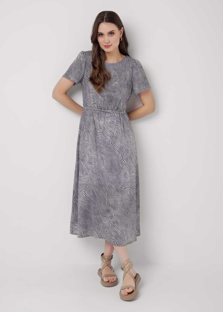 Платье из текстильного полотна штапель, длиной миди. Короткий втачной рукав. Округлая горловина с внутренней обтачкой. Отрезное по линии талии со сборкой на резинку, юбка на подкладе. Узкий пояс из окантовки. На спинке вырез с имитацией запаха.