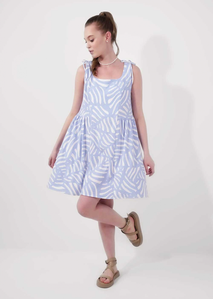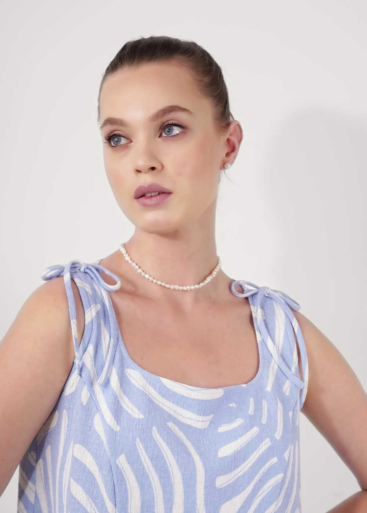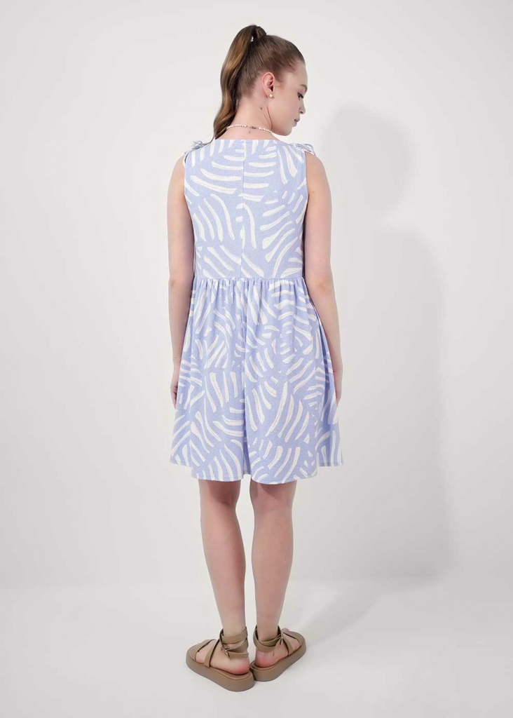 Платье без рукавов из фактурного трикотажного полотна джерси, длиной ниже колена. По горловине и пройме внутренняя окантовка. Отрезное по линии талии, боковые вставки со сборкой. По плечу завязки из окантовки. По спинке средний шов.
