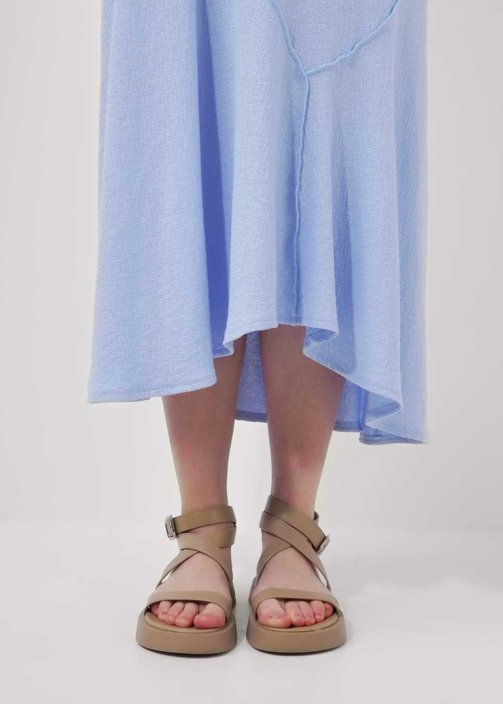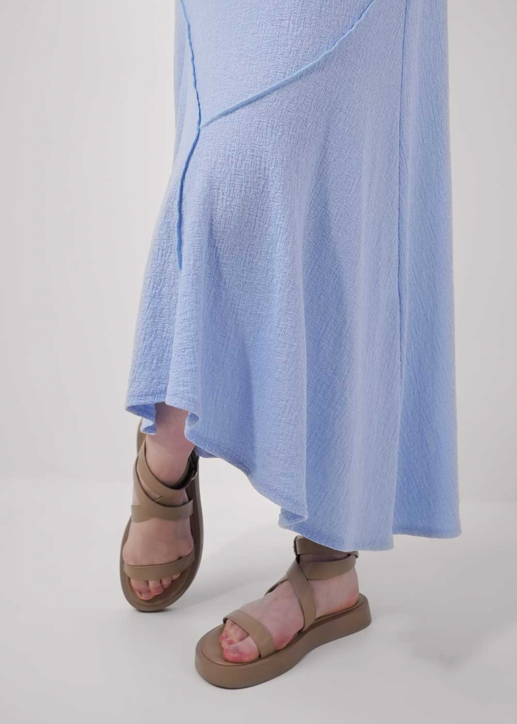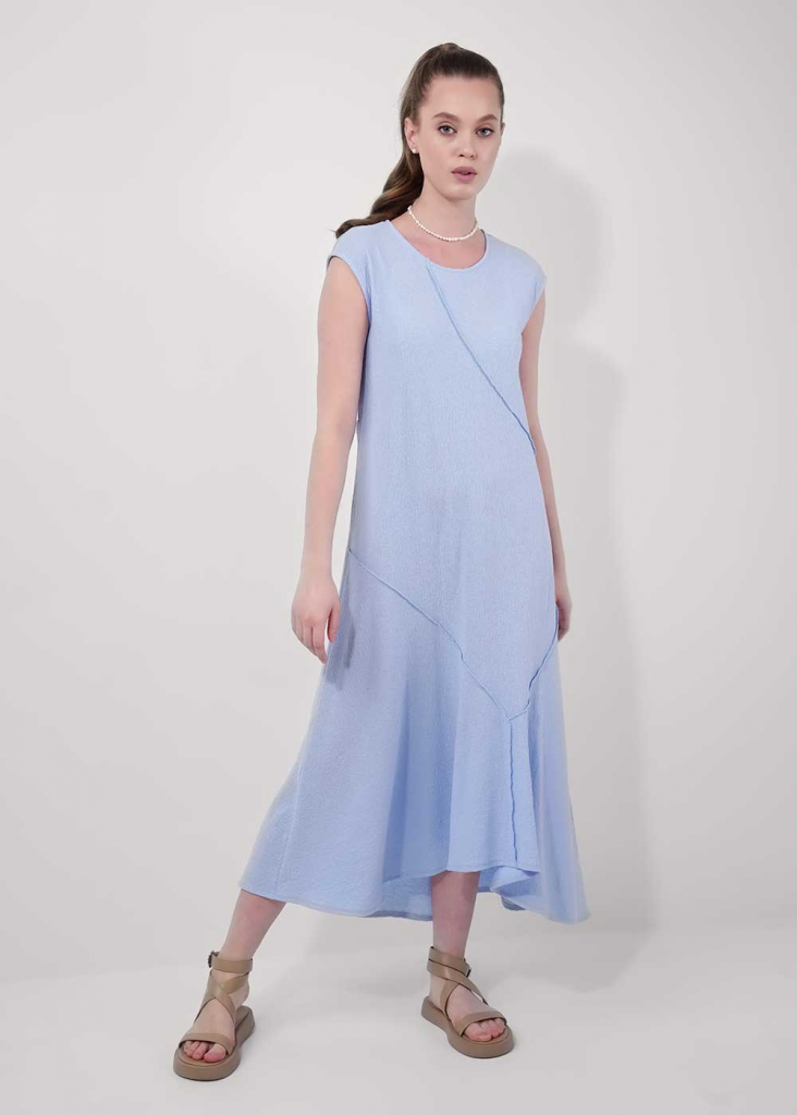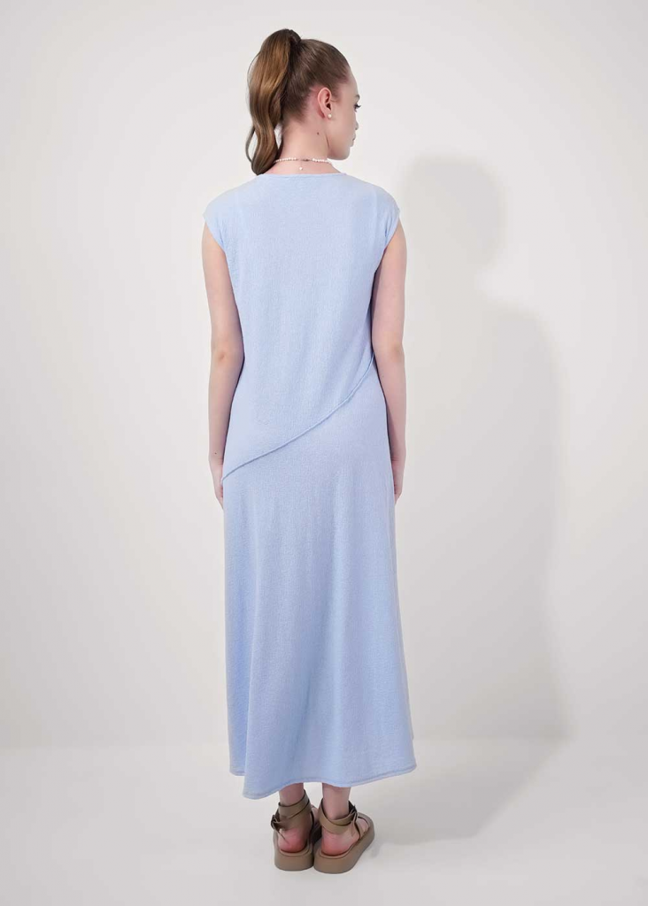 Платье без рукавов из фактурного трикотажного полотна джерси,свободного силуэта. Округлая горловина, по горловине и пройме внутренняя окантовка. По переду и спинке фигурные резы, швы наружные - широкий оверлок.