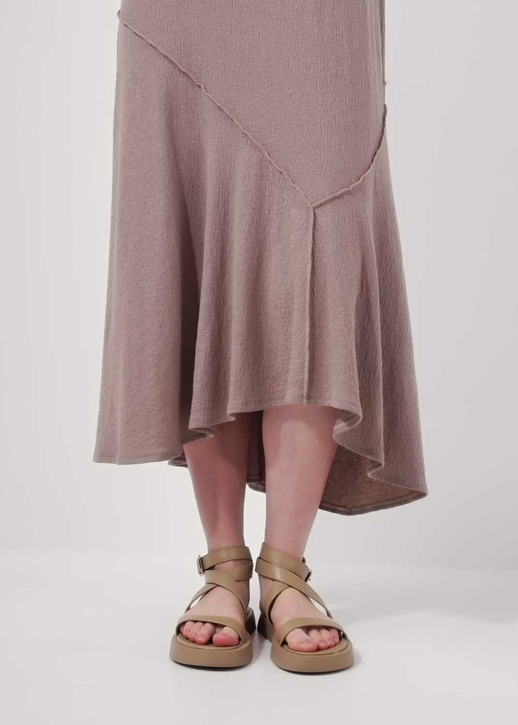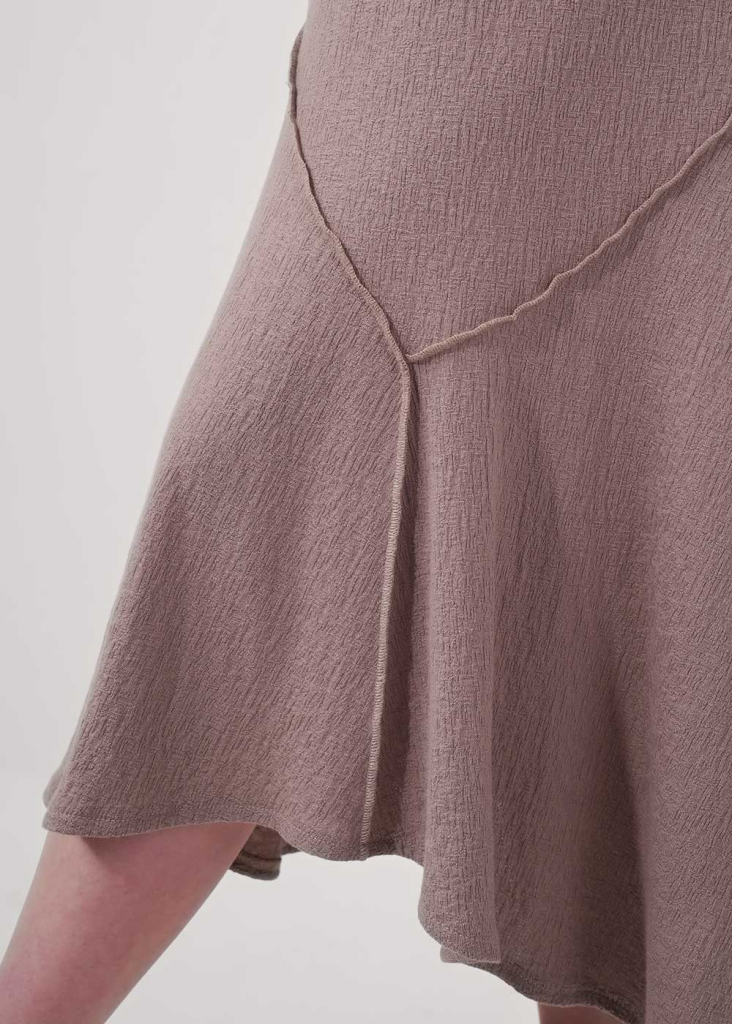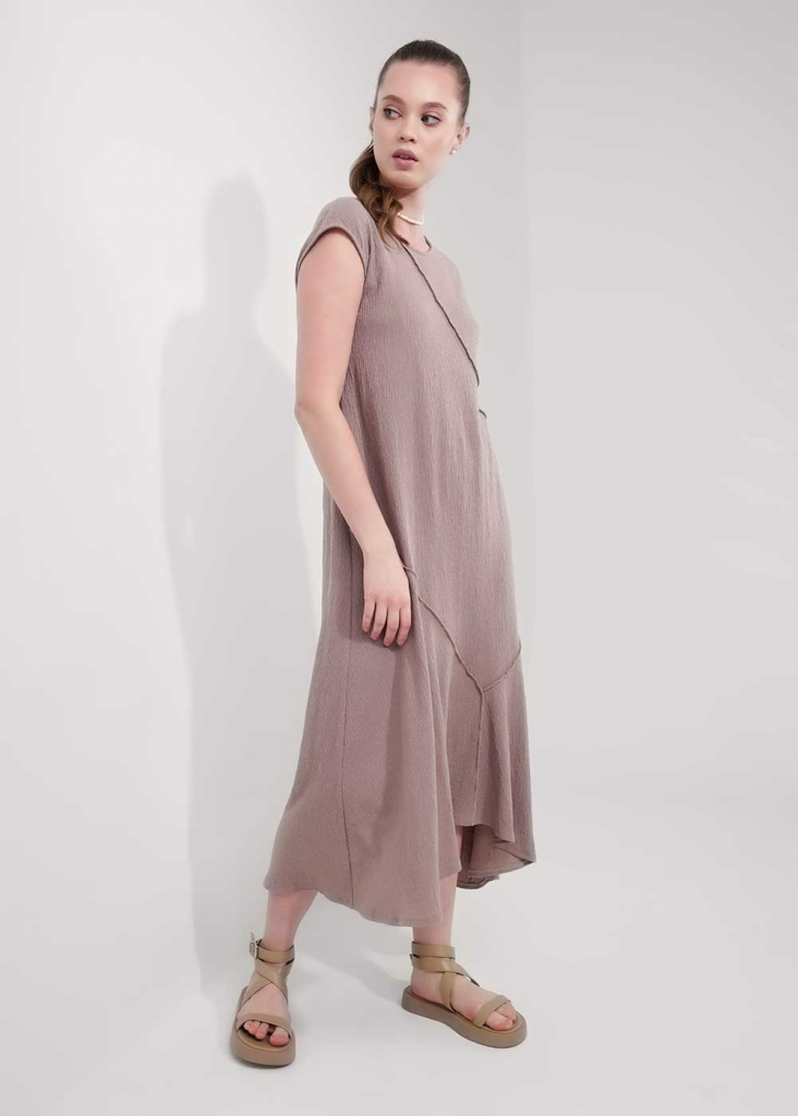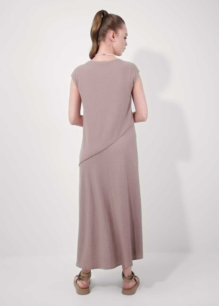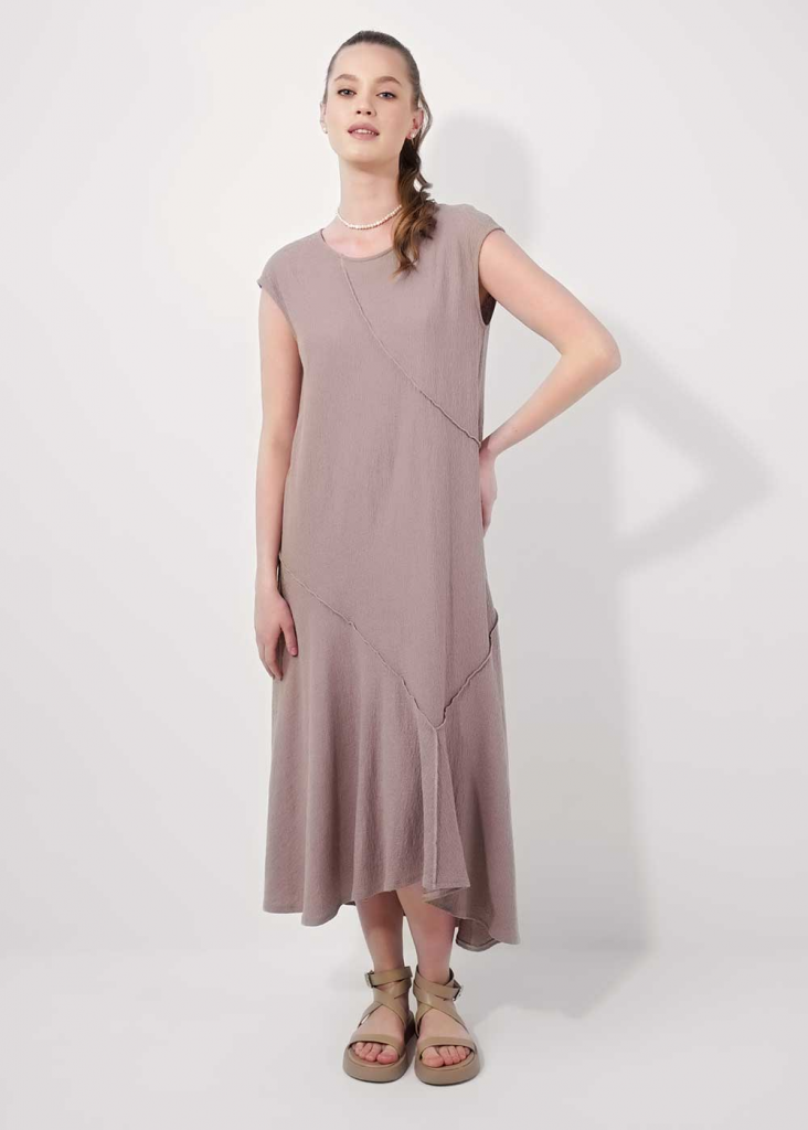 Платье без рукавов из фактурного трикотажного полотна джерси,свободного силуэта. Округлая горловина, по горловине и пройме внутренняя окантовка. По переду и спинке фигурные резы, швы наружные - широкий оверлок.