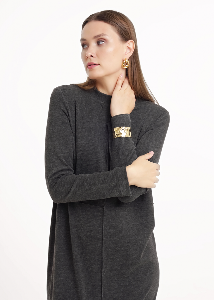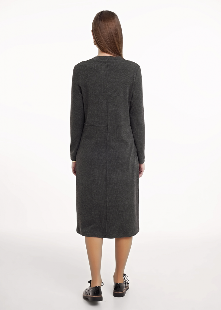 Платье прямого силуэта из трикотажного полотна рибана с вискозой. Длиной ниже колена. Округлая горловина с обтачкой. По переду и спинке вертикальные и горизонтальные защипы. Длинный втачной рукав.