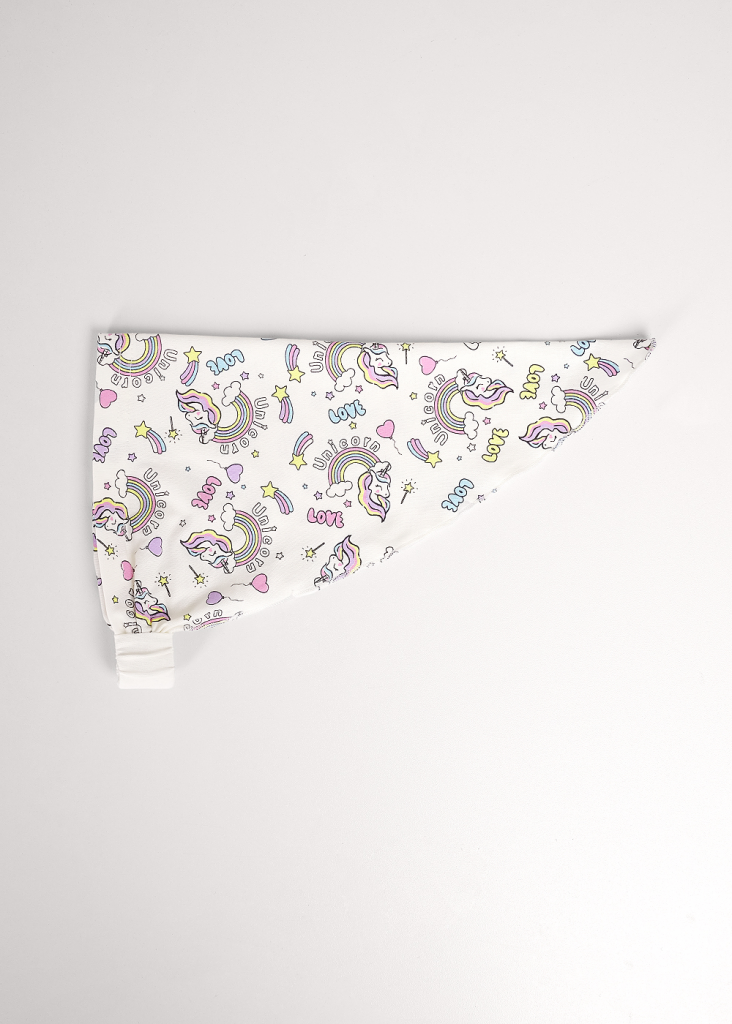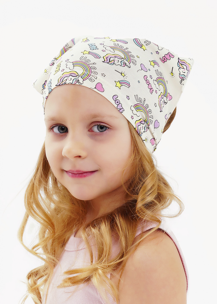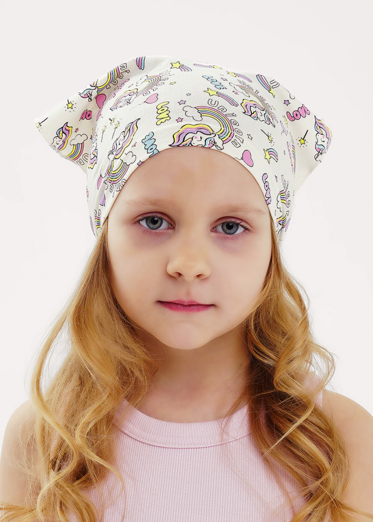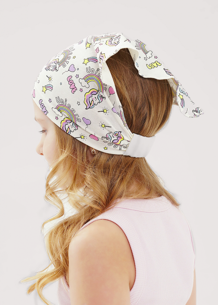 Детская косынка с принтом, в затылочной части эластичная тесьма.