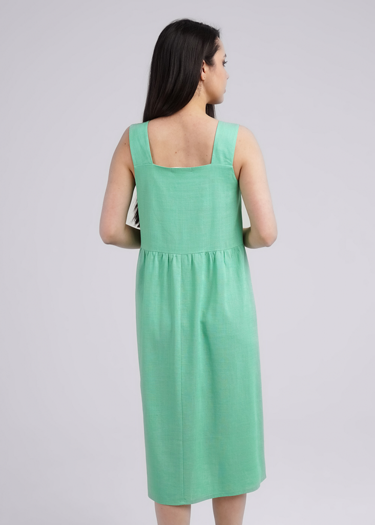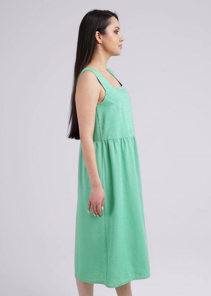 Сарафан из тканого полотна лен с вискозой,свободного кроя отрезной под линией груди со сборкой. Широкие бретели, квадратный вырез, длина миди.