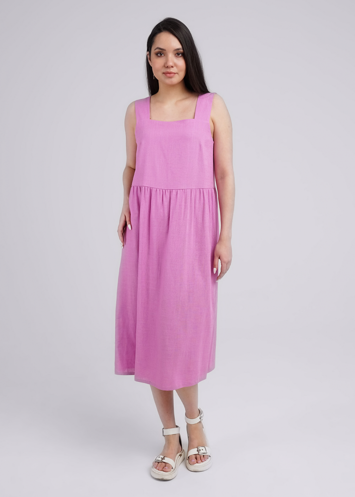 Сарафан из тканого полотна лен с вискозой,свободного кроя отрезной под линией груди со сборкой. Широкие бретели, квадратный вырез, длина миди.