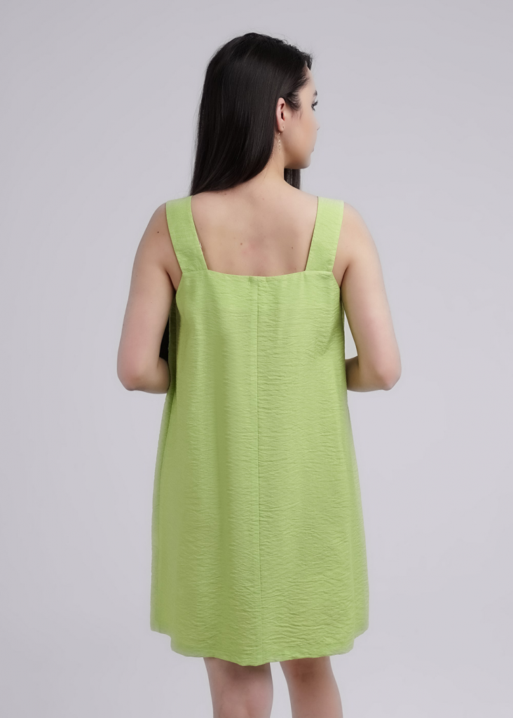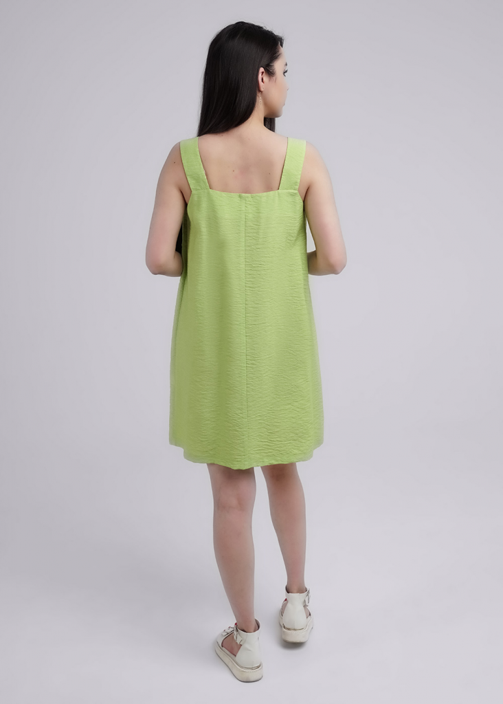 Сарафан из текстильного полотна штапель-креп. Свободного кроя, длиной мини. По горловине внутреняя обтачка, широкая бретель. По спинке средний шов.