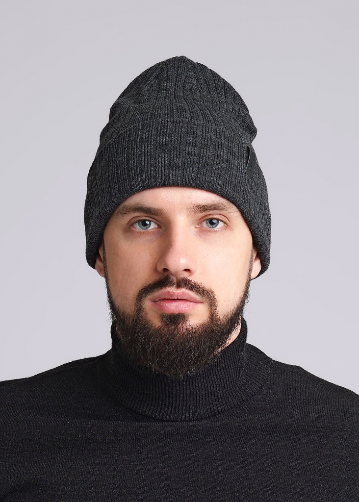 Мужская двойная шапка с отворотом, выполнена ластичным переплетением. Декорирована силиконовой нашивкой в центральной части.