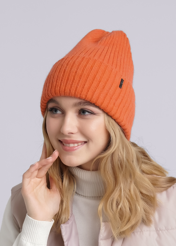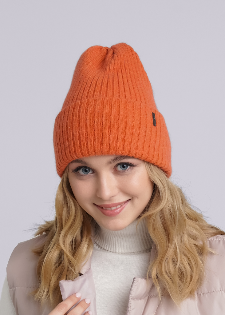 Женская двойная шапка с отворотом, декорирована стильной имиджевой нашивкой. Идеальна для зимы.