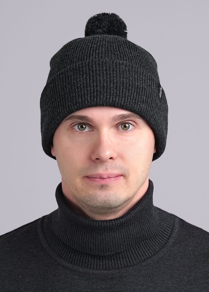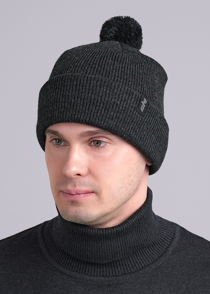Шапка мужская двойная с отворотом. Декорирована стильной нашивкой логотип и ниточным помпоном.
