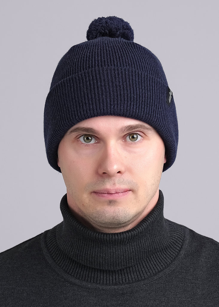 Шапка мужская двойная с отворотом. Декорирована стильной нашивкой логотип и ниточным помпоном.