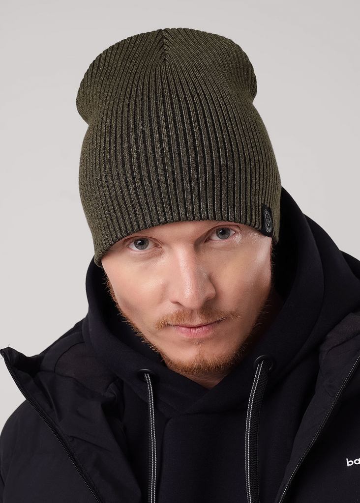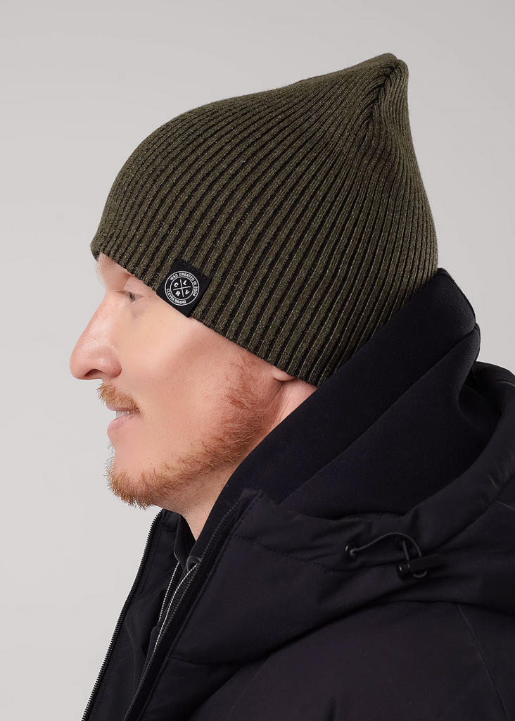 Мужская двойная шапка, декорирована стильной нашивкой в височной зоне. Отлично подойдёт для теплой зимы, холодной осени.