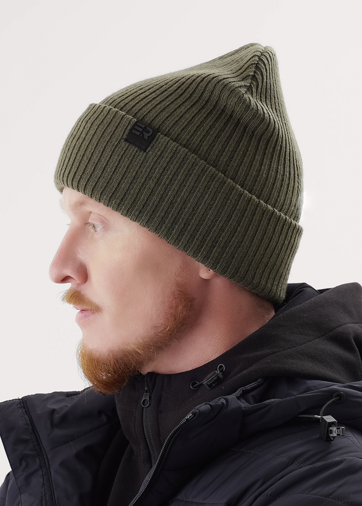 Мужская шапка с отворотом выполнена из высококачественной пряжи с добавлением шерсти, декорирована логотипом- нашивкой.