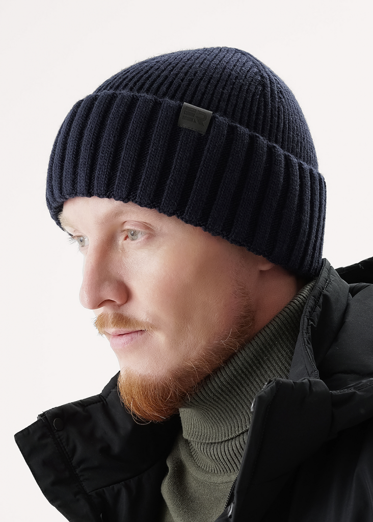 Мужская шапка с отворотом, без подклада. Выполнена из высококачественной пряжи, декорирована стильной нашивкой. Станет не только отличной защитой от холода, но и модным аксессуаром.