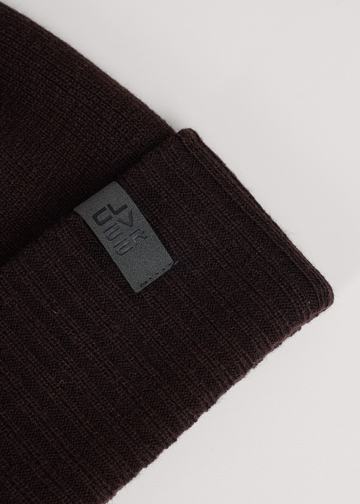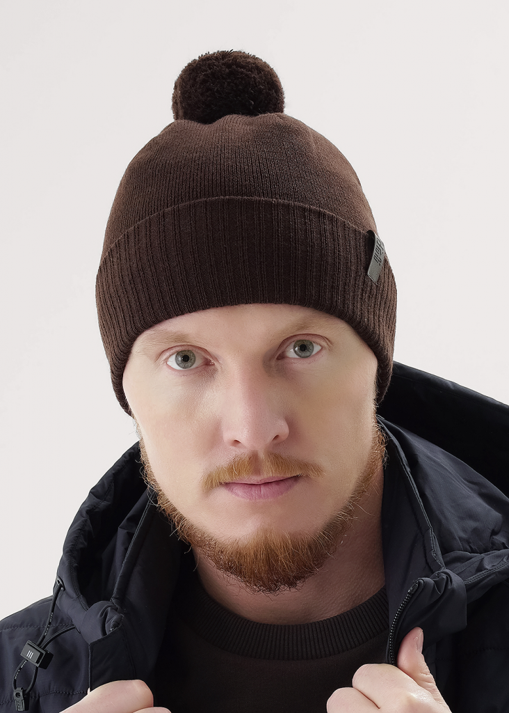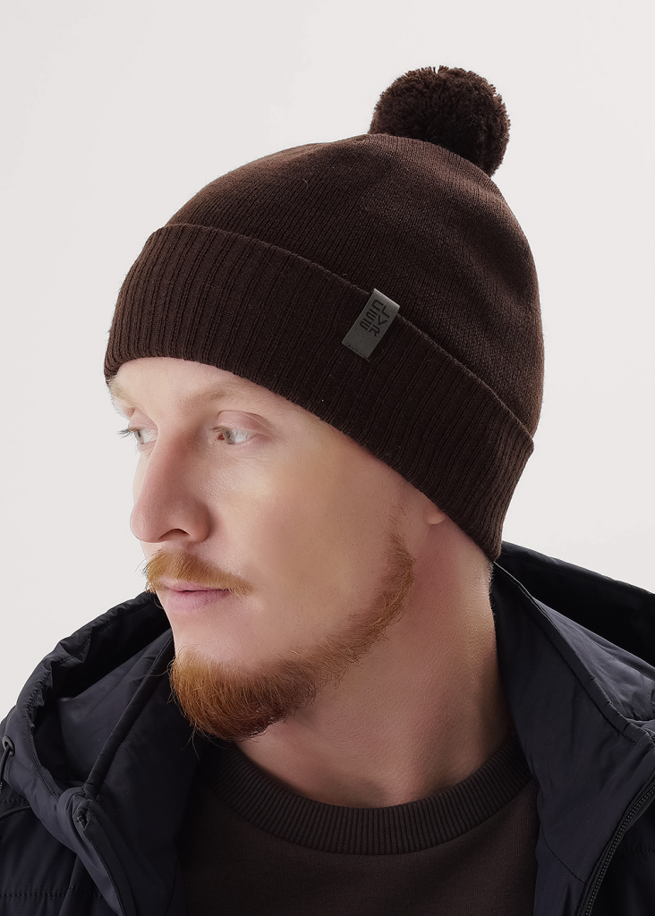 Мужская шапка двойная с отворотом и ниточным пампоном, без подклада. Выполнена из высококачественной пряжи с добавлением шерсти, декорирована стильной нашивкой. Станет не только отличной защитой от холода, но и модным аксессуаром.
